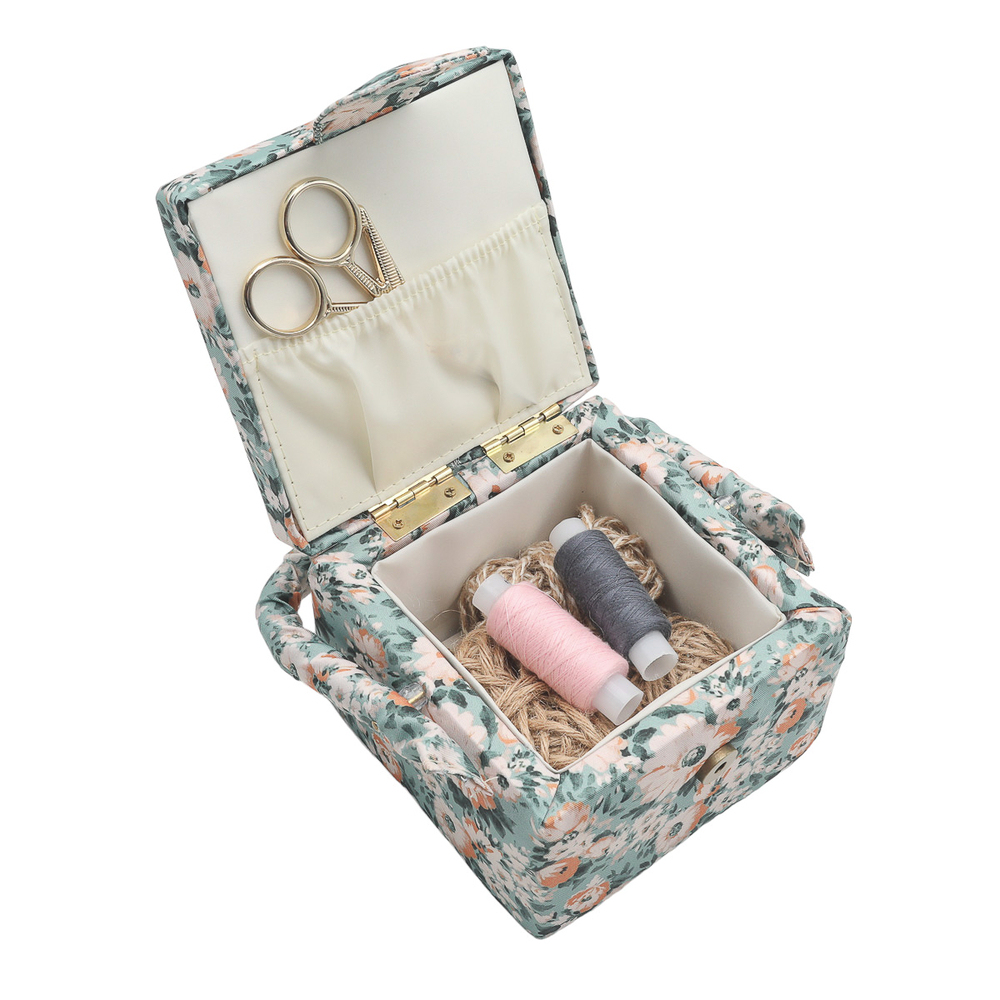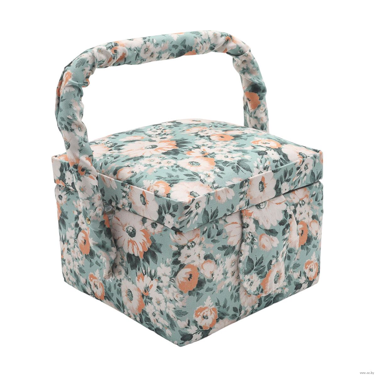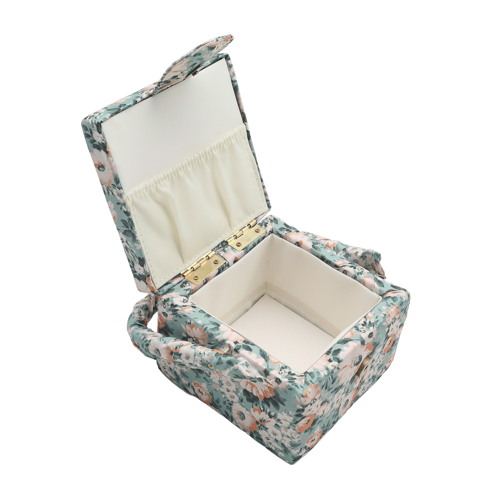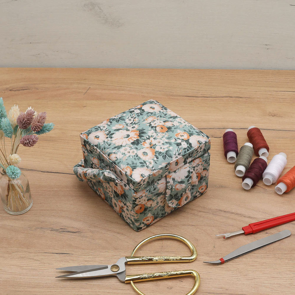 Шкатулка обтянута прочной тканью, украшенной принтом с ромашками.