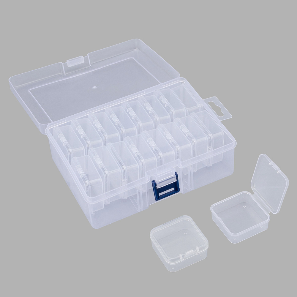 Практичная конструкция включает в себя 18 боксов с плотно закрывающимися защелками. Боксы надежно защищают содержимое от пыли, влаги и рассыпания, сохраняя его в идеальном состоянии.