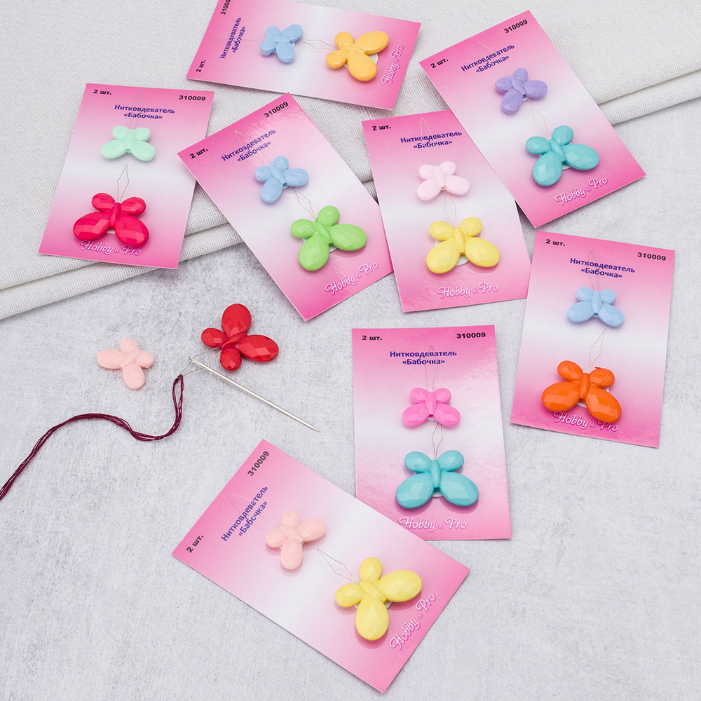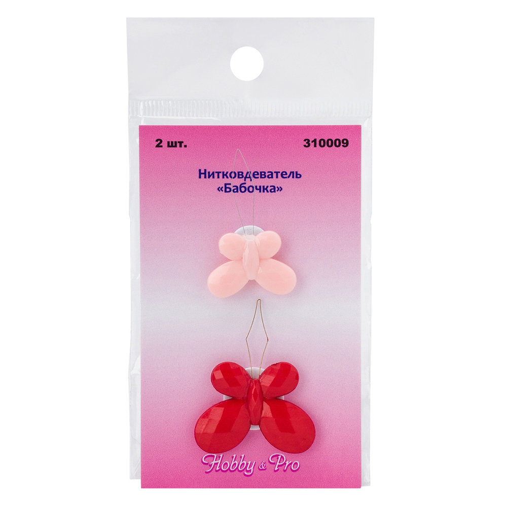 Нитковдеватель для иголки выполнен в виде фигурного пластикового держателя в виде бабочки с проволочным ромбиком или петлей. Принцип работы нитковдевателя не вызовет затруднений даже у новичков. Проденьте проволочную петлю через игольное ушко. Затем в эту петлю вставляется нитка, после чего нитковдеватель аккуратно вытягивается обратно. В результате нить с легкостью проходит через ушко иглы. Этот процесс занимает всего несколько секунд и требует минимальных усилий.