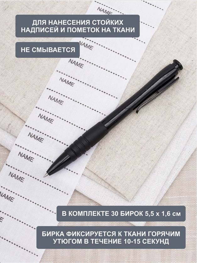 В набор входят 30 качественных приутюживаемых этикеток с местом для персонализированной надписи, например, имени владельца. Это позволяет добавить индивидуальности вашим вещам. Бирки изготовлены из прочного, термостойкого материала. Этикетки не содержат вредных веществ и безопасны для здоровья. Они обладают приятной на ощупь текстурой и не вызывают раздражения кожи.