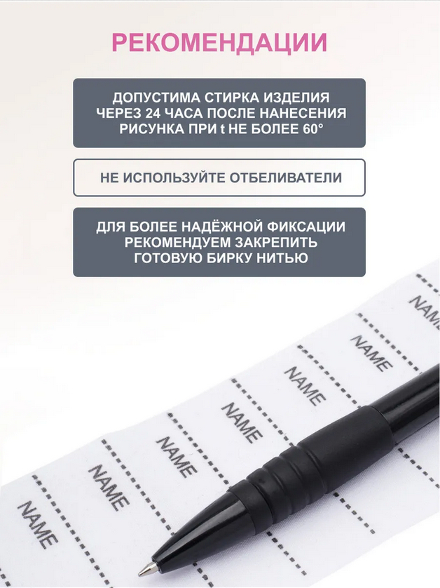 Перед приутюживанием этикетки следует аккуратно приложить к ткани, избегая складок и заломов, а затем прогладить горячим утюгом в течение 10-15 секунд. Для более надежной фиксации рекомендуем усилить бирку ниткой, добавив дополнительные стежки на критических местах.
