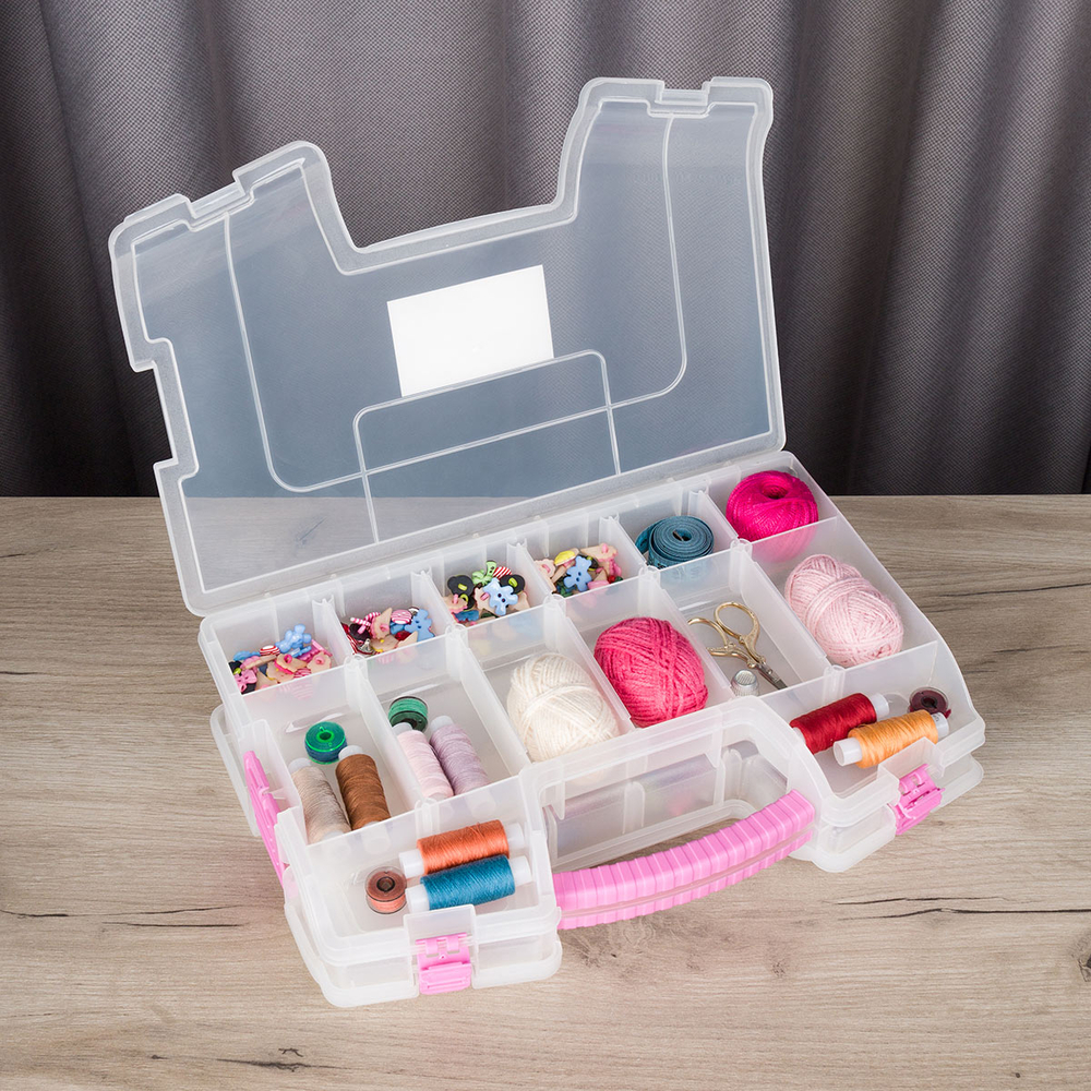 Он с легкостью вместит в себя как инструменты для рукоделия, так и множество других необходимых вещей. Нитки, иглы, пуговицы, булавки, ножницы, канцелярские товары, бижутерия и прочие бытовые принадлежности будут аккуратно сложены, упорядочены и всегда под рукой. Кроме того, он идеально подходит для хранения лекарств, косметики, различных мелочей для дома.