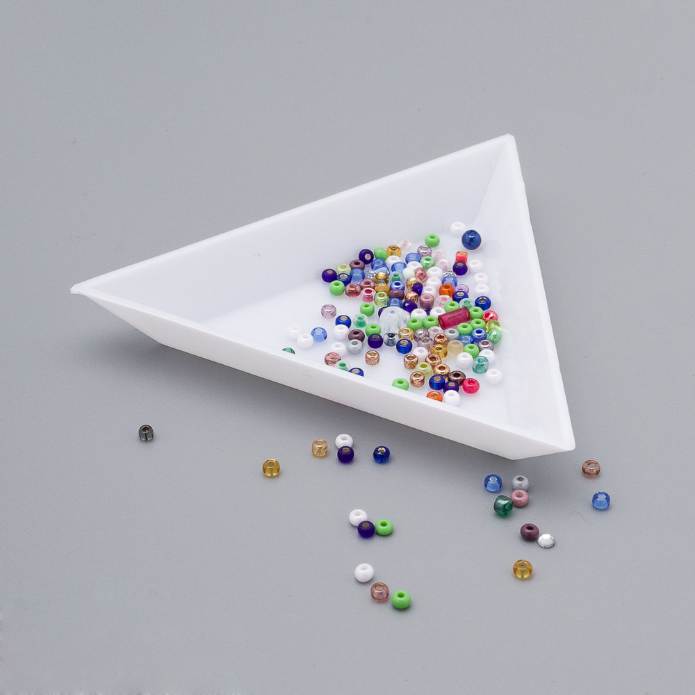 Его уникальная треугольная форма позволяет легко пересыпать содержимое на рабочую поверхность. Бусины и стразы удобно располагать в разные секции, что упрощает процесс работы и дает возможность быстро находить нужные элементы.