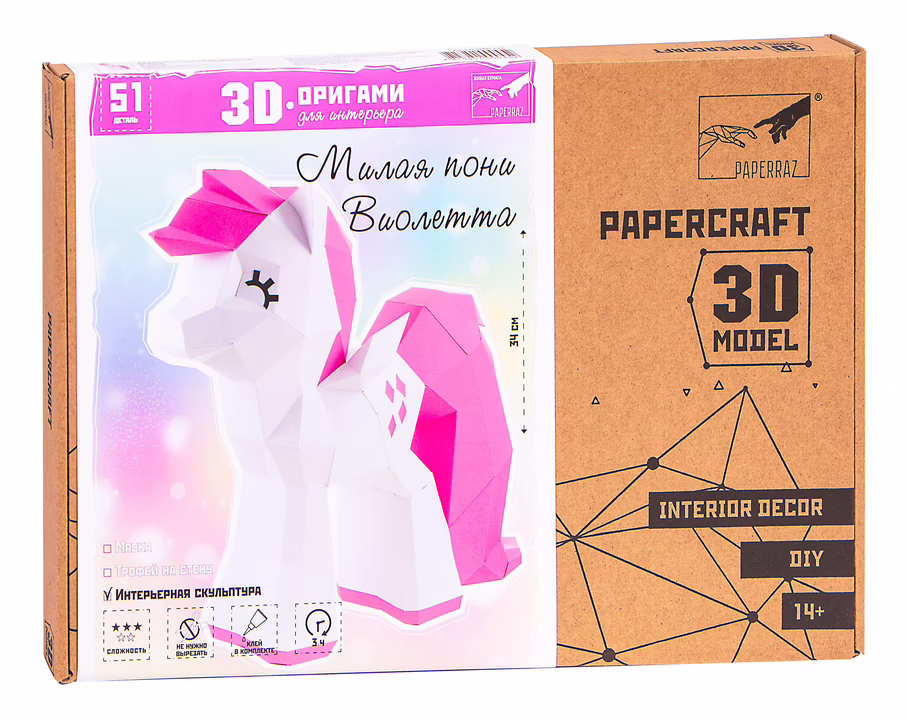 3D-конструктор для сборки полигональной модели "Милая Пони" из дизайнерского картона. Готовая скульптура используется для интерьерного декора. Все детали вырезаны и пронумерованы, подготовлены линии сгиба.