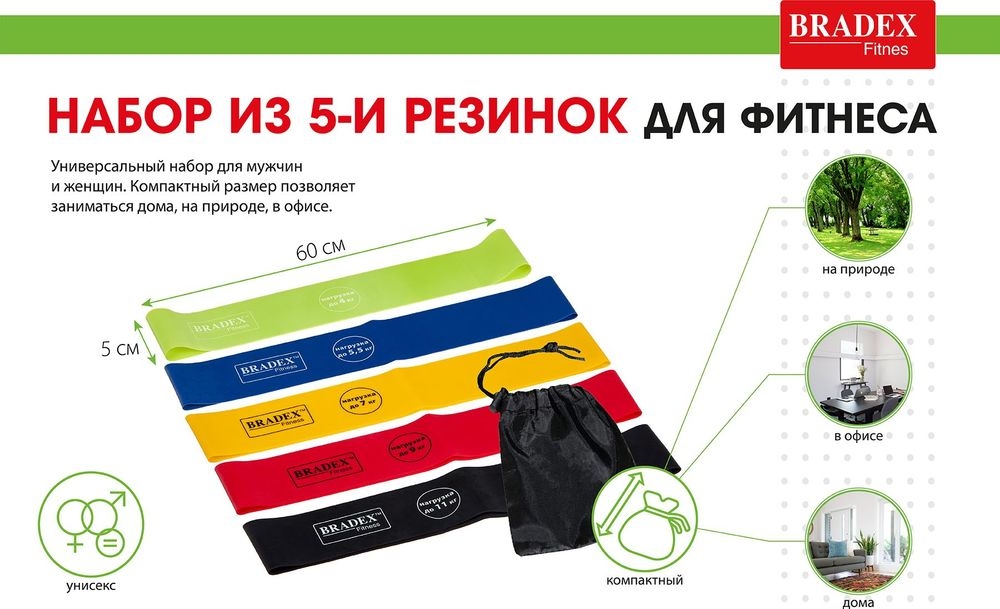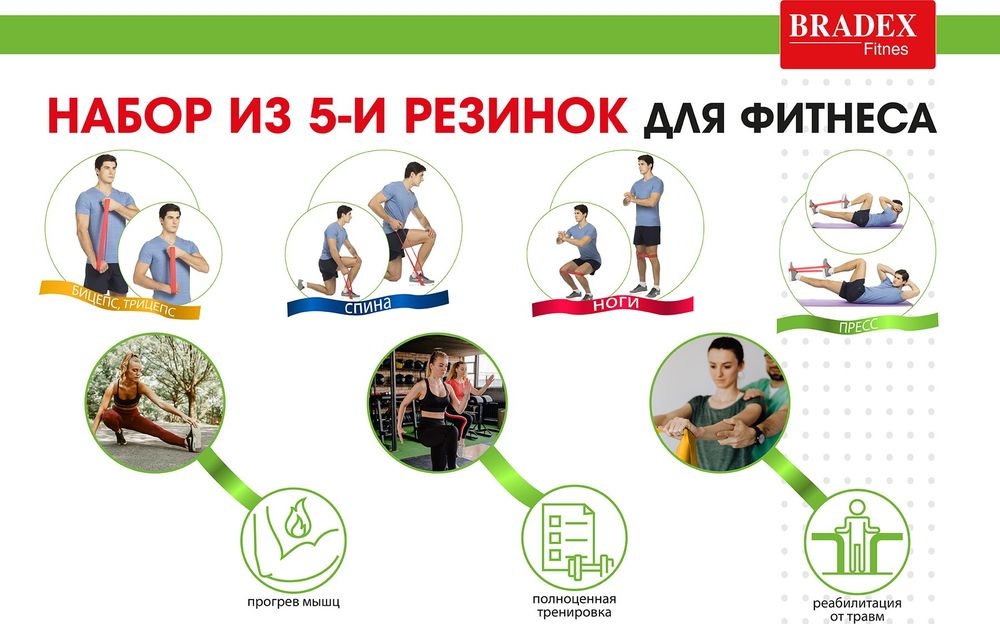 Набор резинок для фитнеса в форме замкнутых петель из тонкого прочного латекса позволяет увеличить эффективность и многообразие выполнения различных упражнений на мышцы рук, ног, плечевого пояса, спины, груди и пресса. При должном старании и периодичности выполнения упражнений резинки отлично подтягивают мышцы, сжигают жир и избавляют от целлюлита.