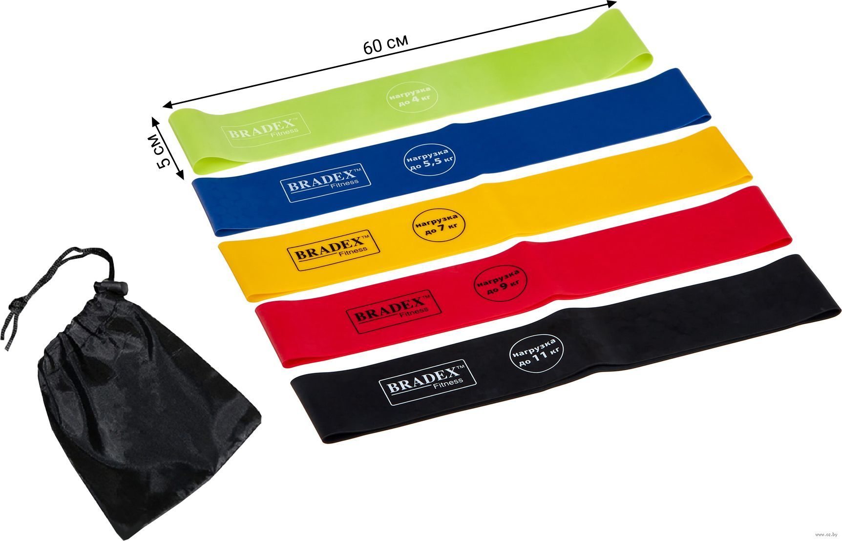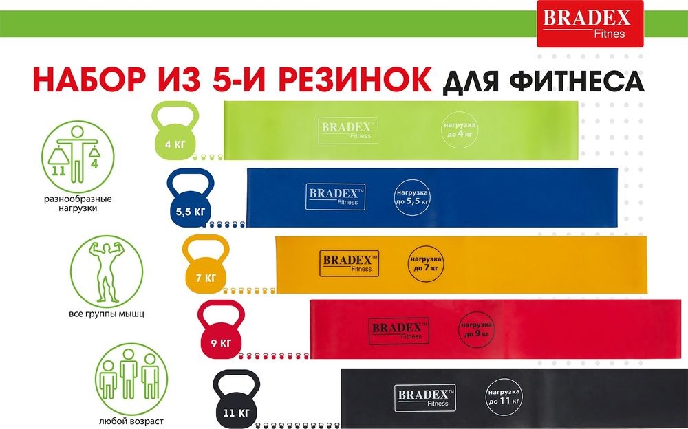 В комплект входят 5 фитнес-лент с нагрузкой 4/5,5/7/9/11 кг – это дает возможность подобрать оптимальную нагрузку для целевых групп мышц. Помимо этого, резинки прекрасно подходят для выполнения статичных упражнений на растяжку.