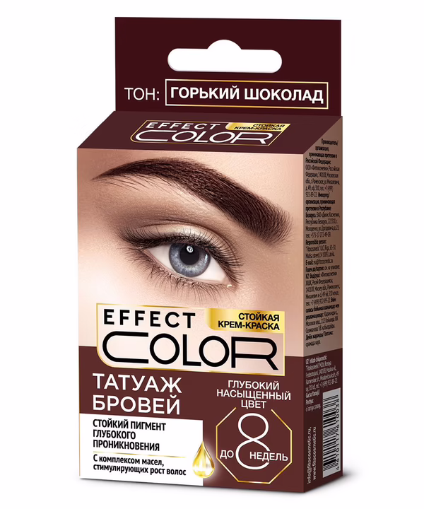 Cтойкая крем-краска "Татуаж бровей" серии Effect color, созданная на основе самых современных профессиональных красящих пигментов, надолго окрашивает брови в глубокий и насыщенный цвет. Ее красящие вещества глубоко проникают не только в структуру волос, но и в кожу, создавая устойчивый эффект татуажа на срок до 8 недель.