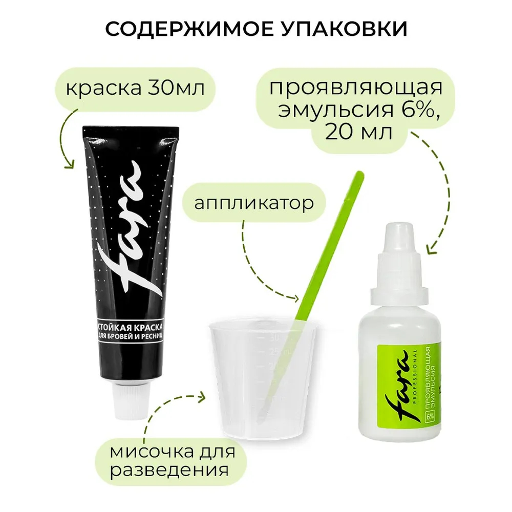 Тщательно очистите ресницы и брови от макияжа и других загрязнений. Для предотвращения окрашивания кожи нанесите небольшое количество любого жирного крема на область вокруг глаз и бровей. Под ресницы положите ватные диски. Перед началом окрашивания наденьте перчатки и набросьте на плечи полотенце для защиты одежды. Выдавить в пластиковый стаканчик 1 часть проявляющей эмульсии из флакона и 2 части краски из тубы, тщательно перемешать до однородной массы. Сразу осторожно наносите приготовленную смесь, избегая попадания на кожу. Во время окрашивания ресниц держите глаза закрытыми. Для интенсивного цвета оставьте для воздействия на 15 минут. По окончании времени воздействия тщательно смойте краску теплой водой. Оставшаяся после окрашивания смесь хранению и повторному использованию не подлежит!Состав