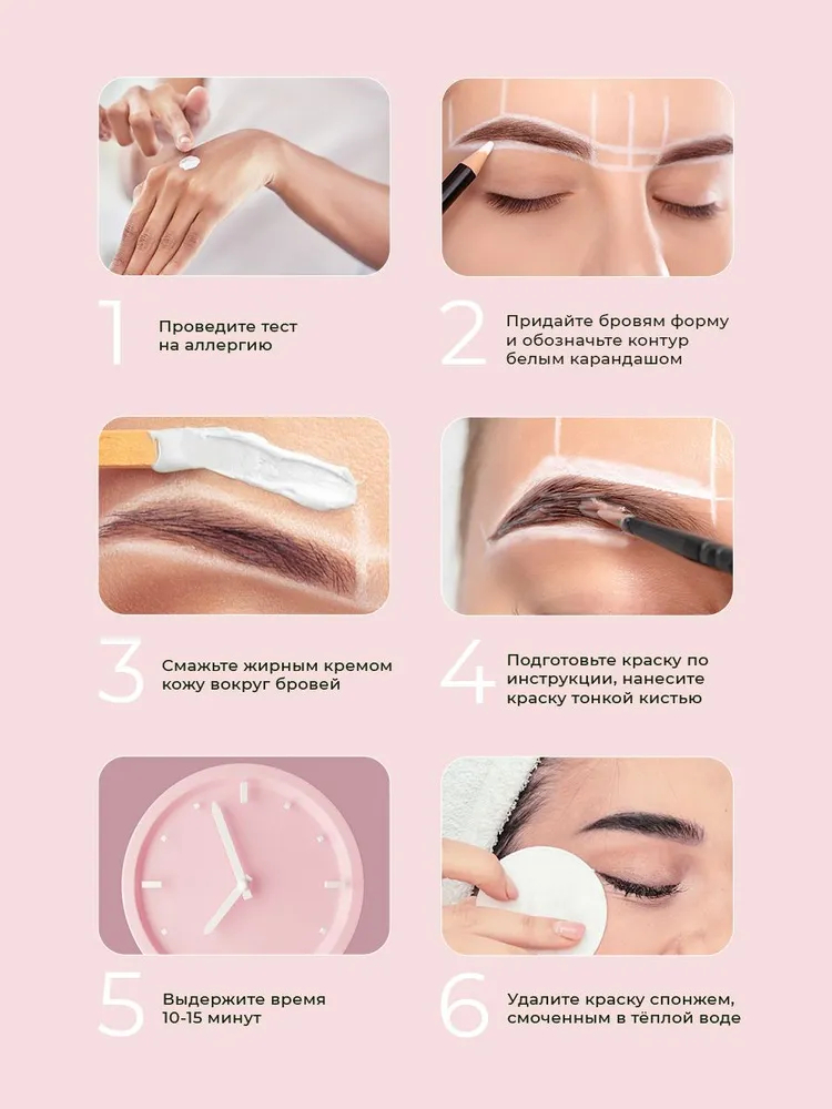Перед процедурой провести тест на чувствительность кожи. Смешайте около 1 см крема с 10-12 каплями активатора из бутылочки до получения однородной консистенции. Время окрашивания 5-10 минут. Краску смойте молочком для демакияжа, затем чистой водой. После окончания процедуры рекомендуется применять увлажняющий крем.Состав