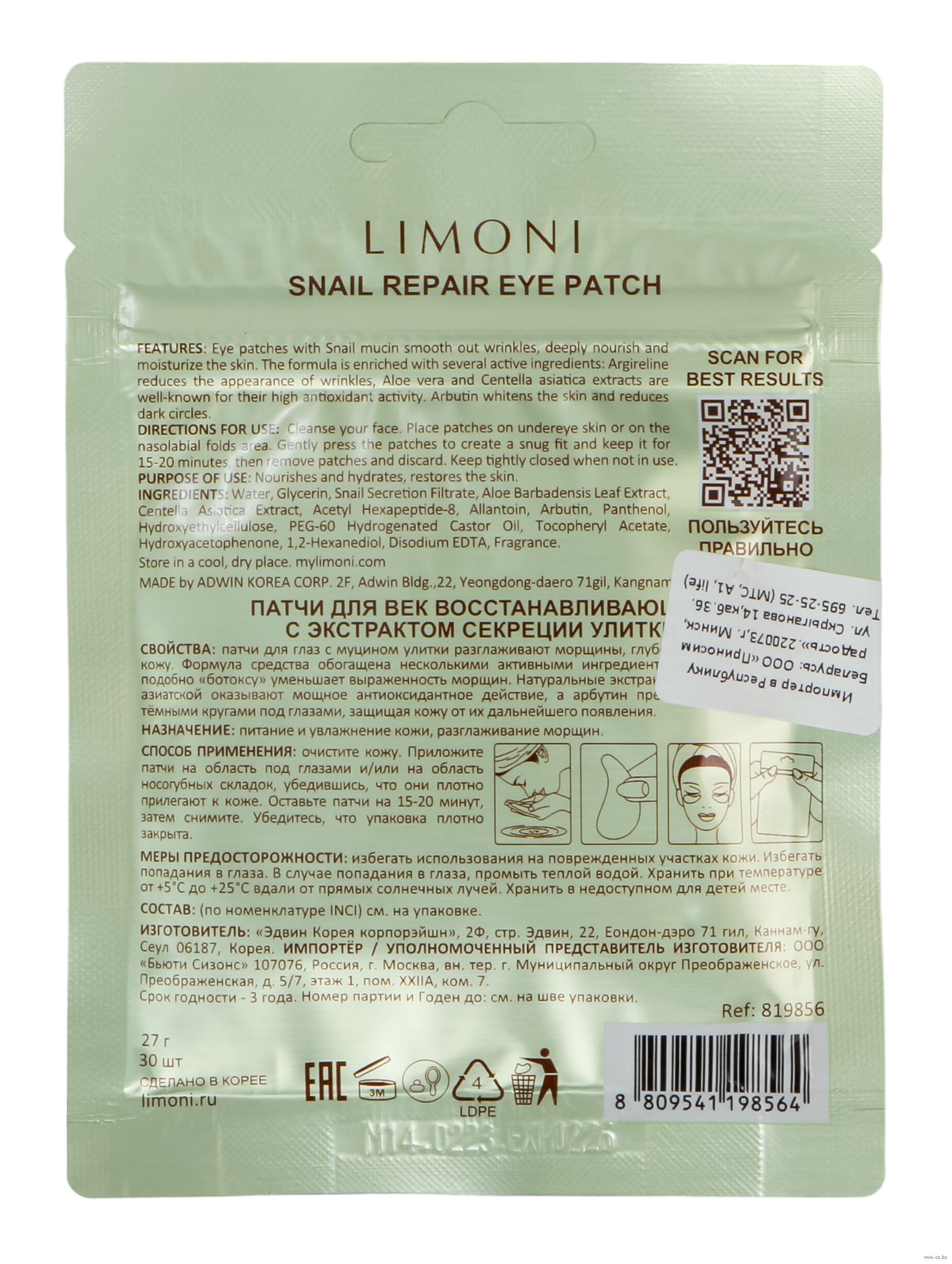 Приложите патчи на предварительно очищенную кожу под глазами, и/или на область носогубных складок. Они должны плотно прилегать к коже. Через 15-20 минут снимите патчи. Похлопывающими движениями распределите оставшуюся эссенцию вокруг глаз и дайте впитатьсяСостав
