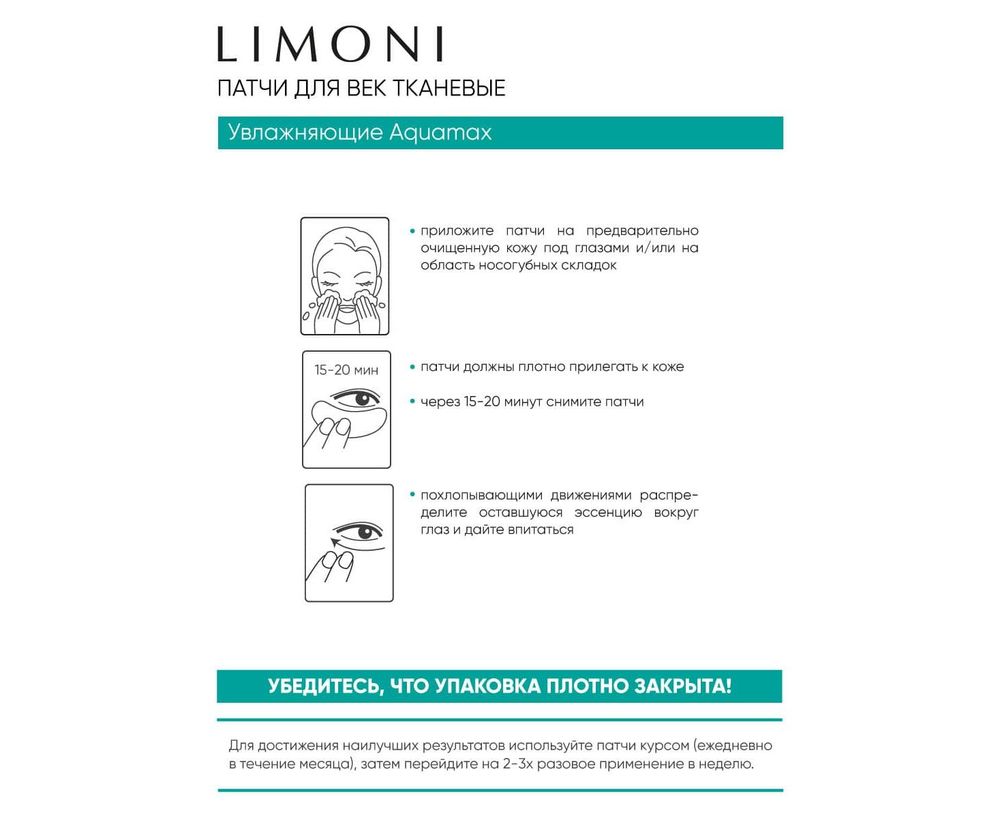 Приложите патчи на предварительно очищенную кожу под глазами, и/или на область носогубных складок. Они должны плотно прилегать к коже. Через 15-20 минут снимите патчи. Похлопывающими движениями распределите оставшуюся эссенцию вокруг глаз и дайте впитаться.Состав