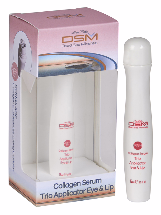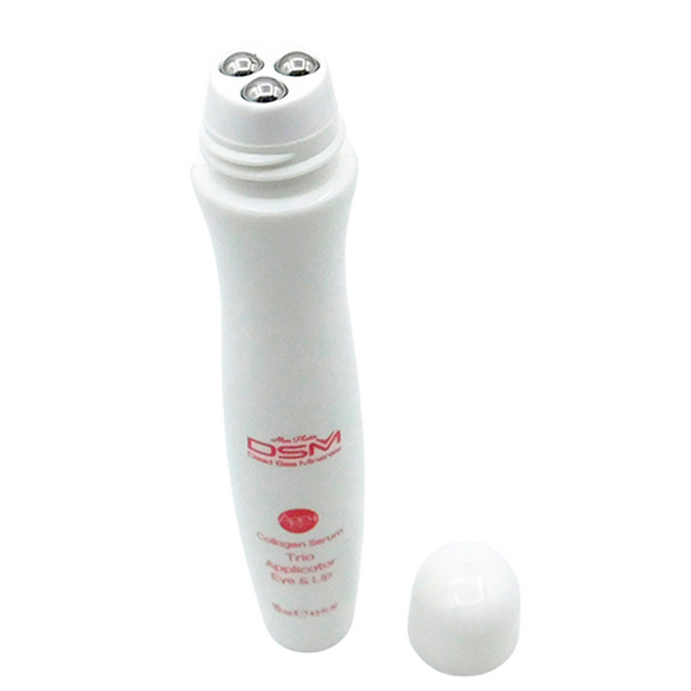 Аппликатор оснащен тремя подвижными роликами, а в составе самого средства числятся коллаген, гиалуроновая кислота, витамины А, Е и минералы Мертвого моря. Все это в комплексе обеспечивает: