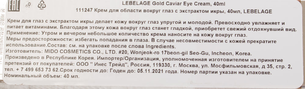 Water, Mineral Oil, Glycerin, Cetyl Alcohol, Stearic Acid, Beeswax, Polysorbate 60, Glyceryl Stearate, PEG-100 Stearate, Butylene Glycol, Caviar Extract, Centella Asiatica Extract, Galactomyces Ferment Filtrate, Allantoin, Phenoxyethanol, Dimethicone, Carbomer, Triethanolamine, Disodium EDTA, Fragrance.Мы используем файлы cookie для обеспечения удобства работы с сайтом и его контакта с пользователем.