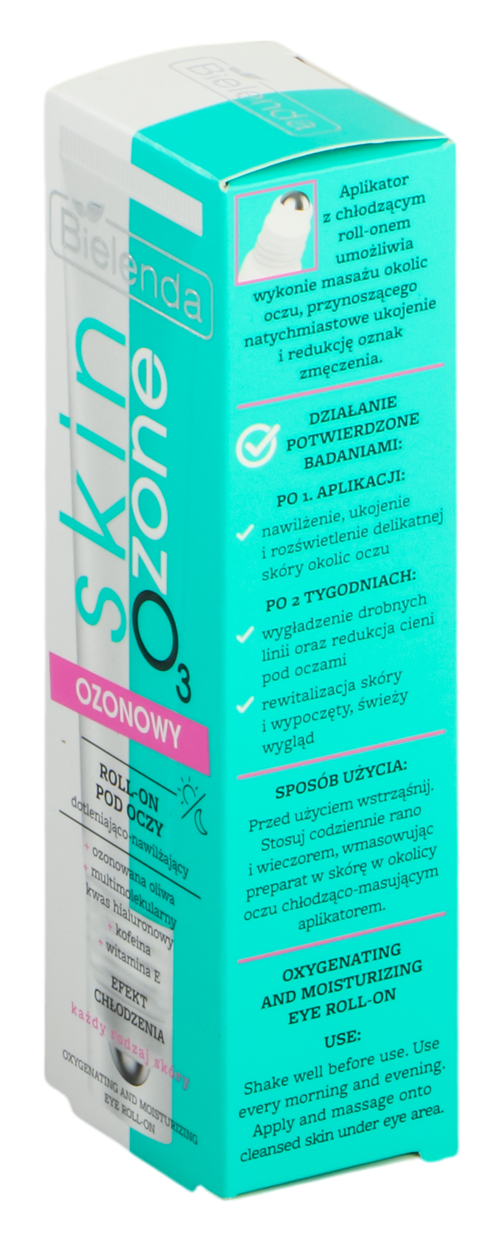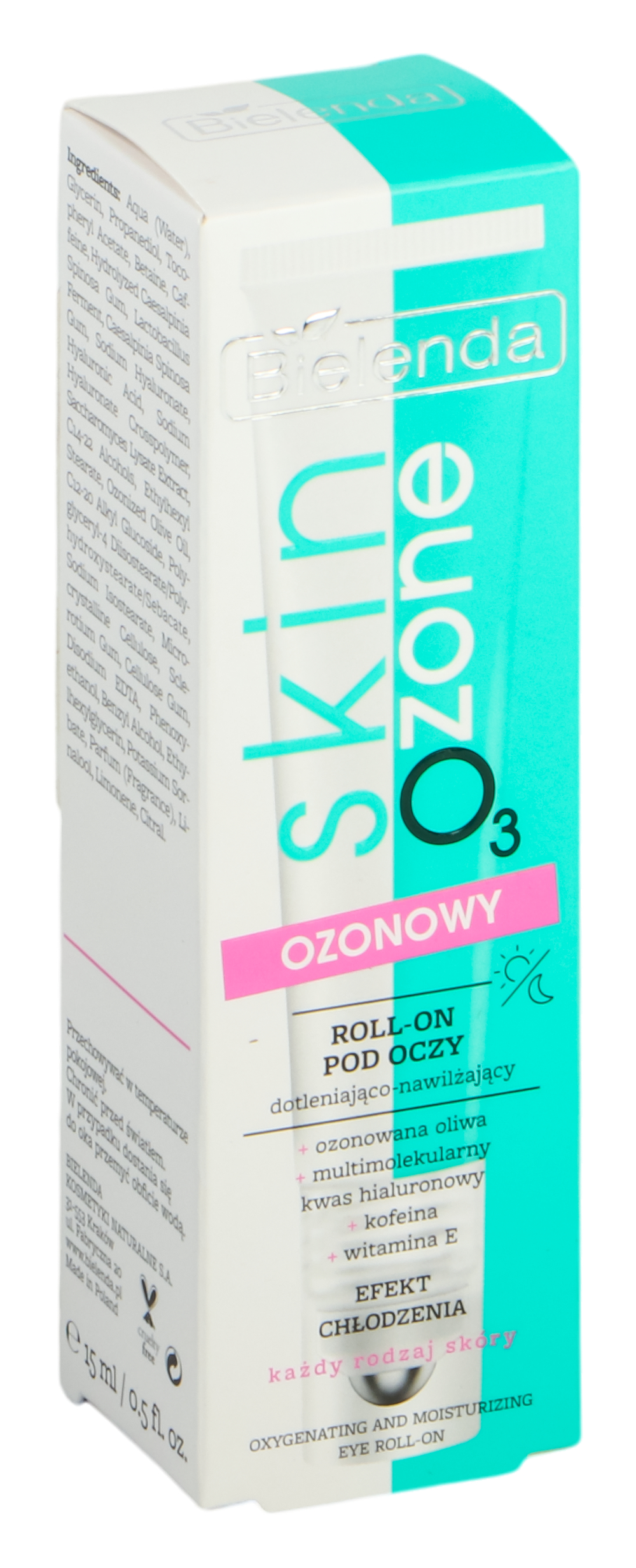 Ozon roll-on Eye от линии Bielenda SKIN O3 ZONE (15 мл) обеспечивает освежение и уменьшение признаков усталости благодаря аппликатору с охлаждающим эффектом. Он содержит озонированное масло, которое оживляет кожу, три формы гиалуроновой кислоты для глубокого увлажнения, кофеин для уменьшения темных кругов и витамин Е, который разглаживает и улучшает эластичность кожи.