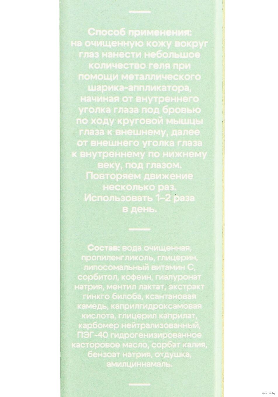 На очищенную кожу вокруг глаз нанести небольшое количество геля при помощи металлического шарика-аппликатора по линиям оттока лимфы: начиная от внутреннего уголка глаза под бровью по ходу круговой мышцы глаза к внешнему, далее от внешнего уголка глаза к внутреннему по нижнему веку, под глазом. Повторите движение несколько раз.Состав