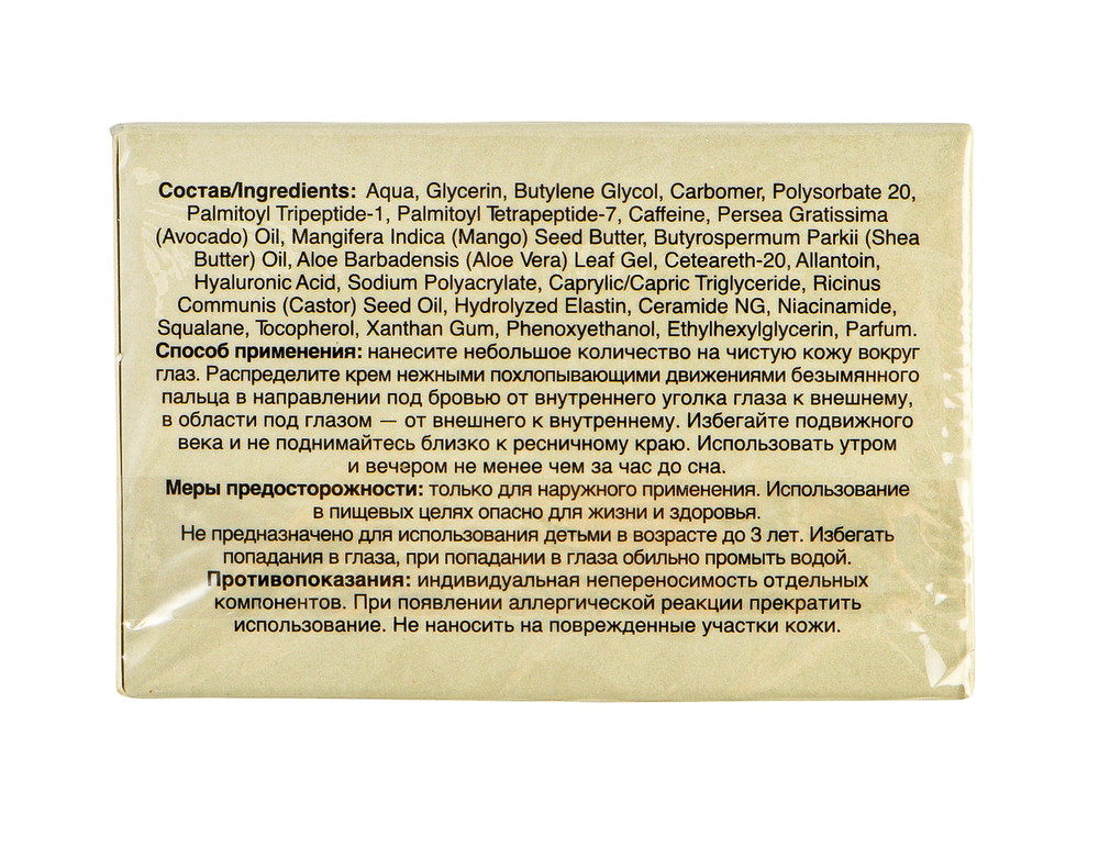 Aqua, Glycerin, Butylene Glycol, Carbomer, Polysorbate 20, Palmitoyl Tripeptide-1, Palmitoyl Tetrapeptide-7, Caffeine, Persea Gratissima (Avocado) Oil, Mangifera Indica (Mango) Seed Butter, Butyrospermum Parkii (Shea Butter) Oil, Aloe Barbadensis (Aloe Vera) Leaf Gel, Ceteareth-20, Allantoin, Hyaluronic Acid, Sodium Polyacrylate, Caprylic/Capric Triglyceride, Ricinus Communis (Castor) Seed Oil, Hydrolyzed Elastin, Ceramide NG, Niacinamide, Squalane, Tocopherol, Xanthan Gum, Phenoxyethanol, Ethylhexylglycerin, Parfum.