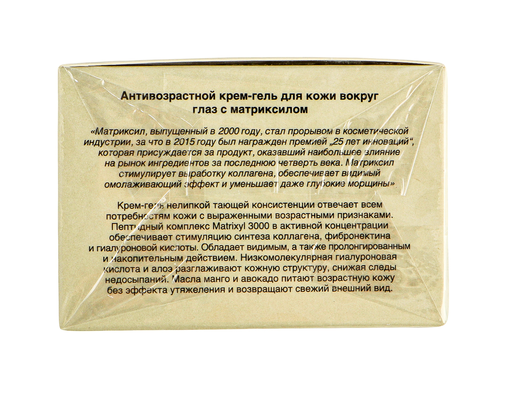Крем-гель нелипкой тающей консистенции отвечает всем потребностям кожи с выраженными возрастными признаками. Пептидный комплекс Matrixyl 3000 в активной концентрации обеспечивает стимуляцию синтеза коллагена, фибронектина и гиалуроновой кислоты. Обладает видимым, а также пролонгированным и накопительным действием. Низкомолекулярная гиалуроновая кислота и алоэ разглаживают кожную структуру, снижая следы недосыпаний. Масла манго и авокадо питают возрастную кожу без эффекта утяжеления и возвращают свежий внешний вид.