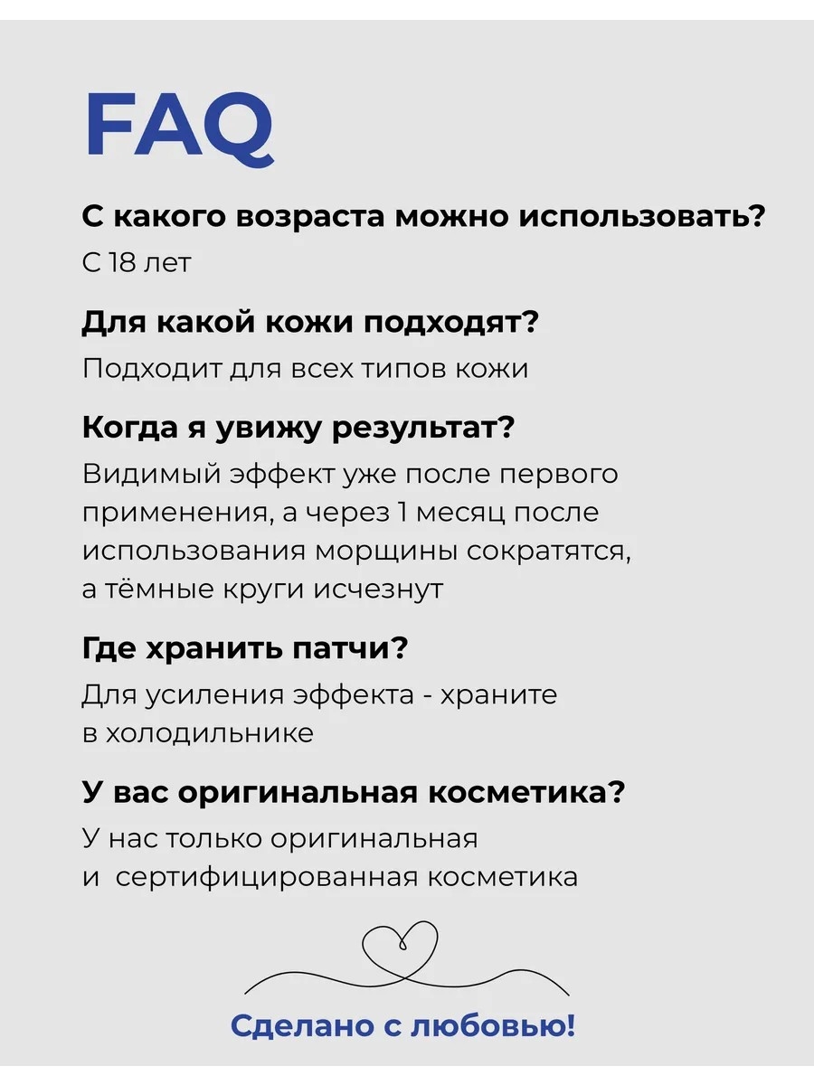 Извлеките патчи с помощью лопаточки. Приложите их к необходимому участку кожи лица. Спустя 30 минут, когда патчи станут прозрачными, снимите их. Похлопывающими движениями вмассируйте в кожу остатки средства.Состав