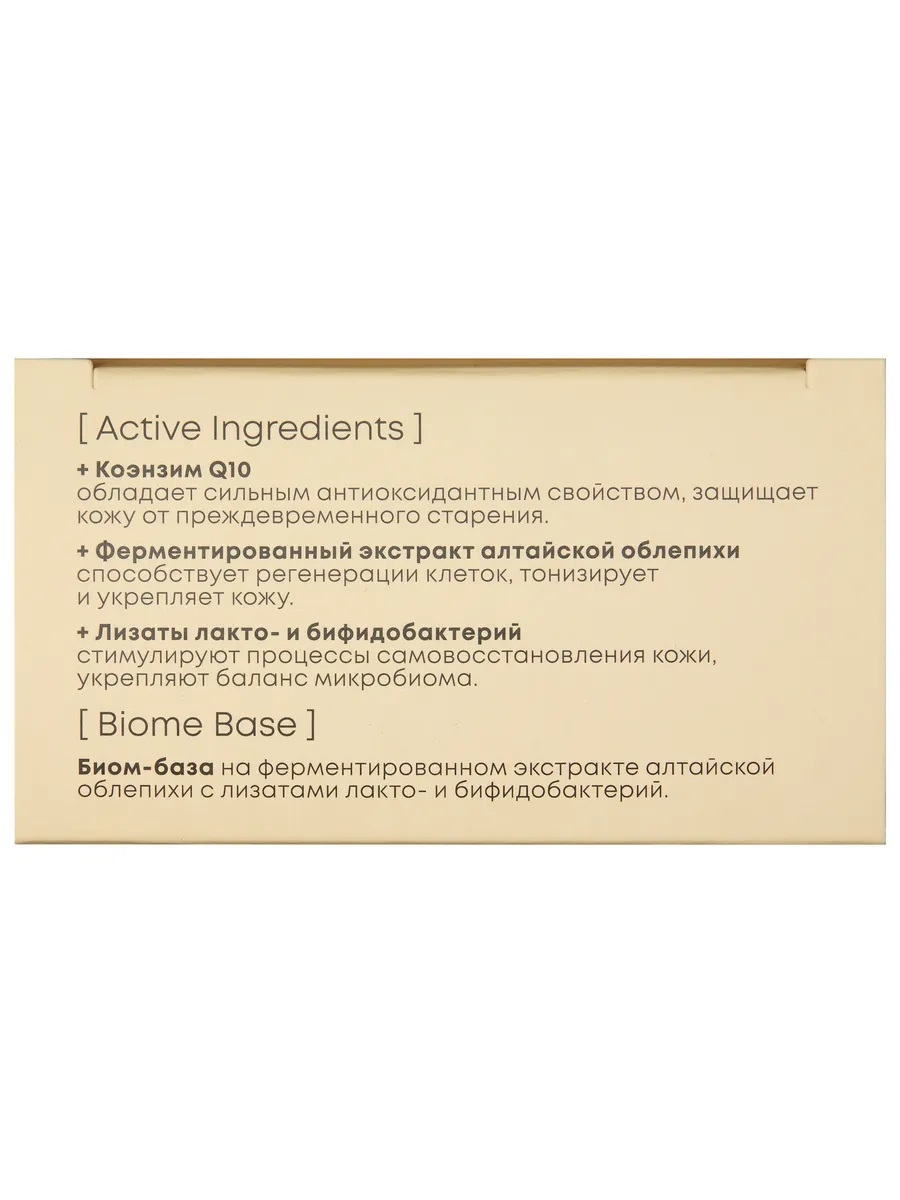 Aqua with infusions of Hippophae Rhamnoides Ferment Filtrate (ферментированный экстракт алтайской облепихи), Pinus Pumila Needle Extract (экстракт кедрового стланика), Pinus Sibirica Seed Extract (экстракт кедра сибирского), Abies Sachalinensis Bud Extract (экстракт пихты сахалинской), Melissa Officinalis Leaf Extract (экстракт мелиссы), Rosa Davurica Leaf Extract (экстракт розы даурской), Aralia Mandshurica Leaf/Stem Extract (экстракт аралии маньчжурской); Glycerin, Butylene Glycol, Carrageenan, Niacinamide, Caffeine, Heptyl Glucoside, Xanthan Gum, Cellulose Gum, Algin, Sodium Hyaluronate, Ubiquinone, Lactobacillus Ferment Lysate, Bifida Ferment Lysate, Lactococcus Ferment Lysate, 1,2-Hexanediol, Benzyl Alcohol, Ethylhexylglycerin, Sodium Benzoate, Potassium Sorbate, Citric Acid, Parfum, CI 77891, CI 19140, CI 16255.