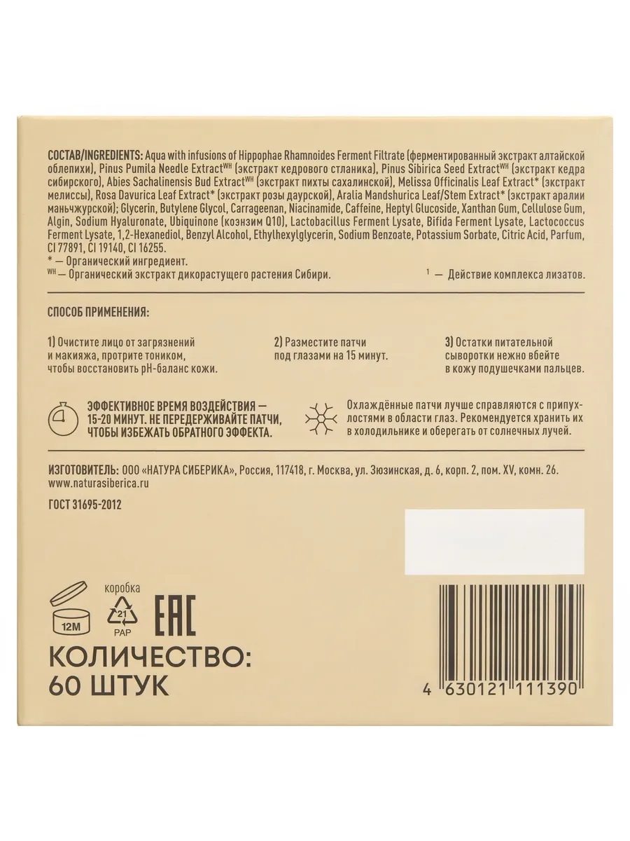 | Изготовитель | ООО «Натура Сиберика», Россия, г. Москва, ул. Зюзинская, д. 6 корп. 2, пом xv ком 26, 117418 |