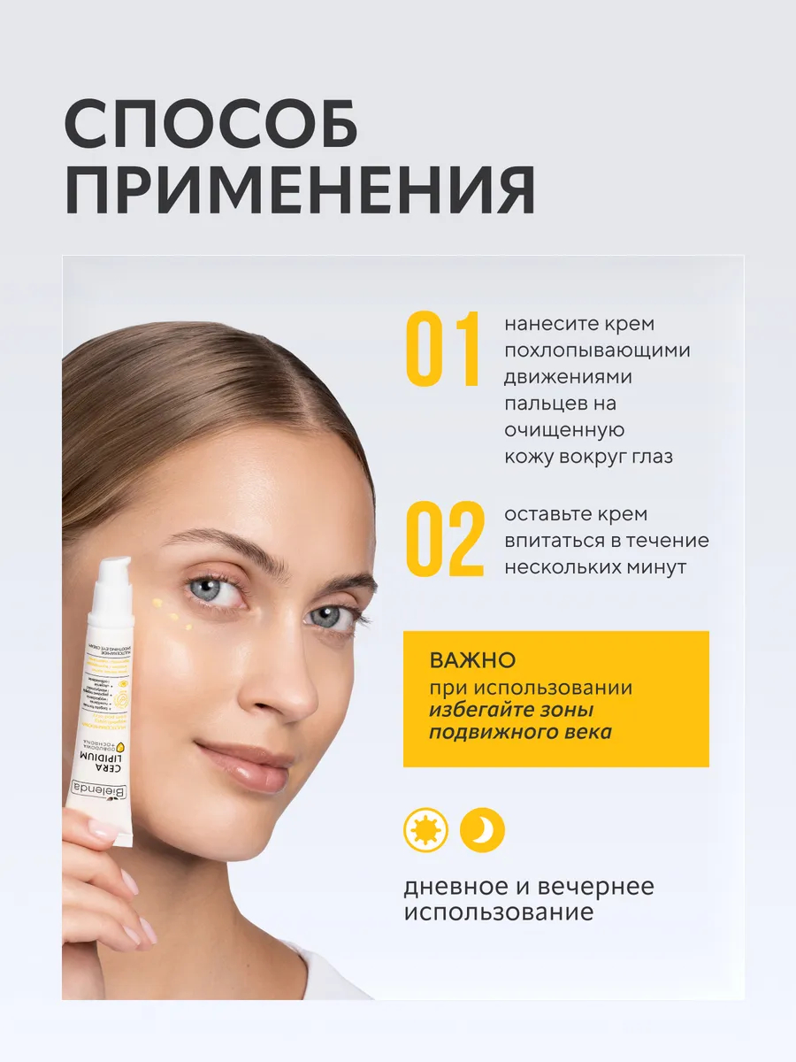 Ежедневно утром и/или вечером наносите небольшое количество крема на очищенную кожу вокруг глаз. Аккуратно помассируйте кончиками пальцев, избегая линии ресниц. Дайте впитаться.Состав