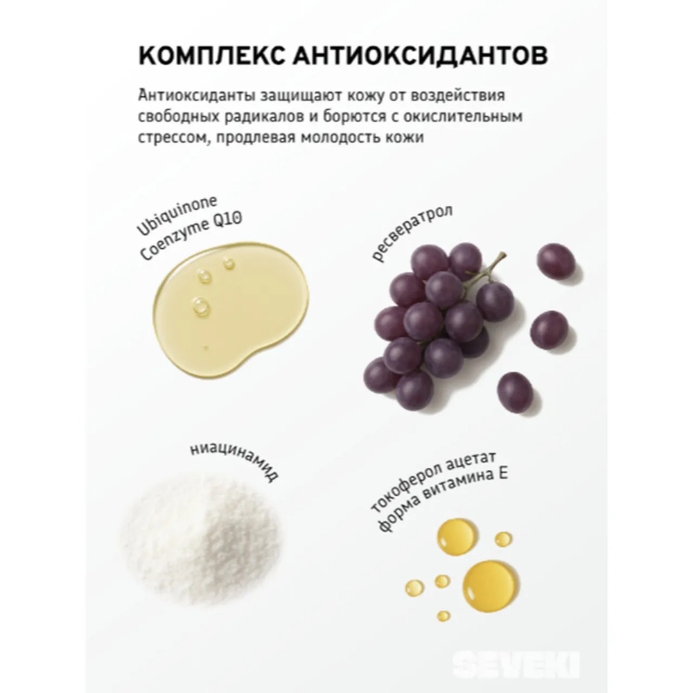 Комплекс антиоксидантов: Ubiquinone (Coenzyme Q10), Ресвератрол, Ниацинамид, Токоферол Ацетат (форма витамина Е) – защищает кожу от воздействия свободных радикалов и борется с окислительным стрессом, продлевая молодость кожи.
