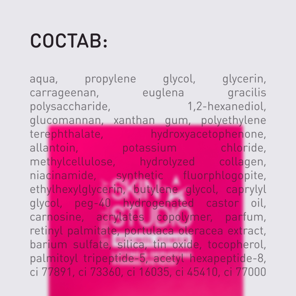 Aqua, Propylene Glycol, Glycerin, Carrageenan, Euglena Gracilis Polysaccharide, 1,2-hexanediol, Glucomannan, Xanthan Gum, Polyethylene Terephthalate, Hydroxyacetophenone, Allantoin, Potassium Chloride, Methylcellulose, Hydrolyzed Collagen, Niacinamide, Synthetic Fluorphlogopite, Ethylhexylglycerin, Butylene Glycol, Caprylyl Glycol, Peg-40 Hydrogenated Castor Oil, Carnosine, Acrylates Copolymer, Parfum, Retinyl Palmitate, Portulaca Oleracea Extract, Barium Sulfate, Silica, Tin Oxide, Tocopherol, Palmitoyl Tripeptide-5, Acetyl Hexapeptide-8, Ci 77891, Ci 73360, Ci 16035, Ci 45410, Ci 77000.