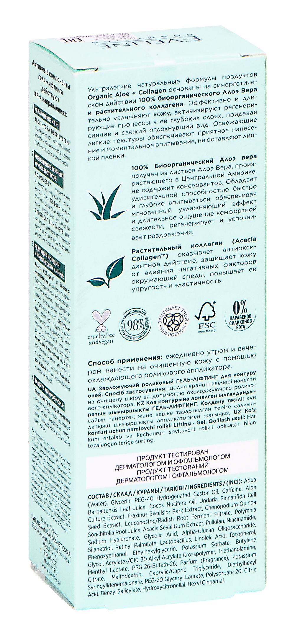 Увлажняющий роликовый гель-лифтинг для контура глаз – это продукт, который сделает кожу вокруг глаз подтянутой, увлажненной и разглаженной. Его веганская формула, созданная в сотрудничестве с дерматологом, содержит 98% компонентов натурального происхождения, основными среди которых являются: биоорганический экстракт алоэ аloehydradeepsystemtm – глубоко увлажняет кожу, adipolesstm, cytobioltm lumin-eye и кофеин – уменьшают темные круги под глазами и устраняют признаки усталости, улучшают состояние кожи вокруг глаз.