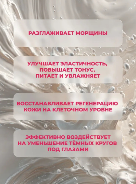 Уменьшает тёмные круги под глазами, разглаживает морщины, улучшает эластичность, повышает тонус, питает и увлажняет, восстанавливает регенерацию кожи на клеточном уровне, активируя внутренние процессы омоложения.