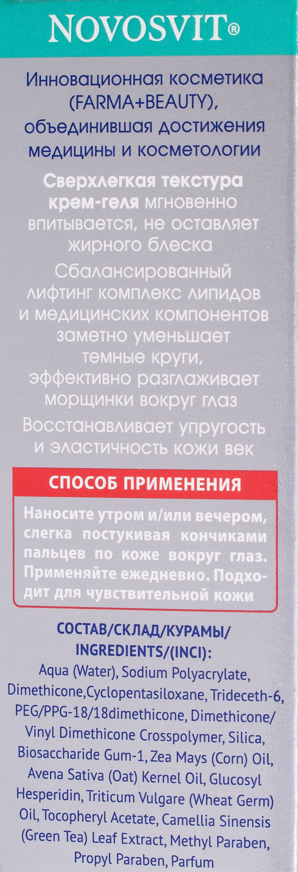 Лаборатория "Novosvit-LAB" создала сверхлегкую текстуру, подтягивающий крем равномерно распределяется по кожному покрову, мгновенно впитывается, не растягивая нежную кожу век.