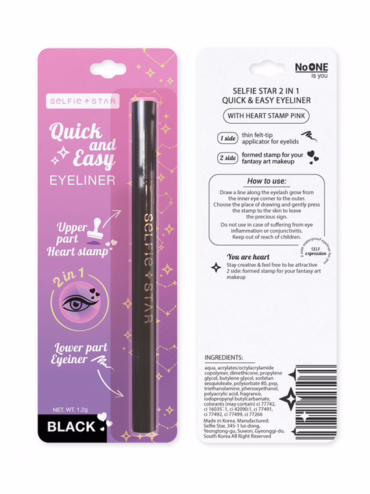 Двусторонняя подводка Selfie Star – это лайнер с тонким аппликатором для век с одной стороны и штампом для арт-макияжа в виде сердечка с другой. Удобный аппликатор с первого раза выделит линию ресниц и поможет нарисовать аккуратные стрелки, а оригинальный штамп в виде сердечка сделает образ особенным.