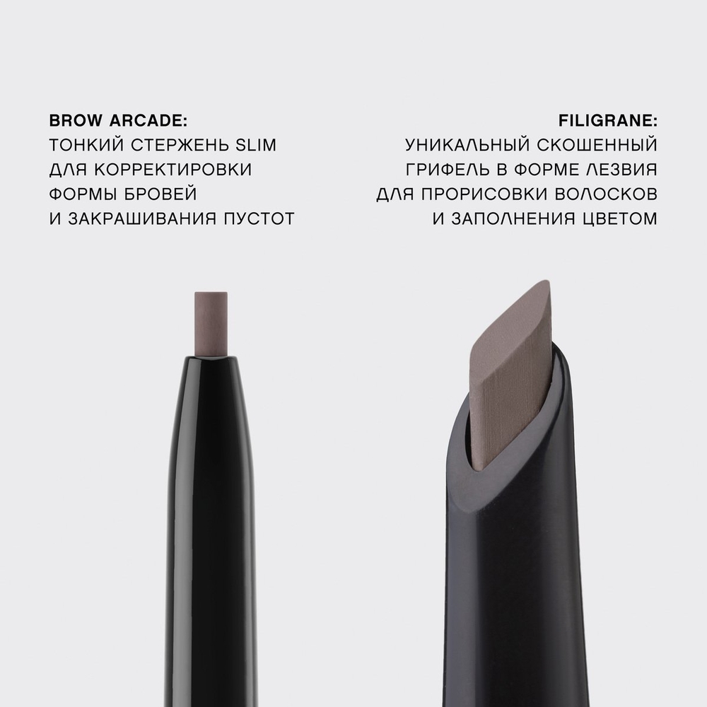 Уникальность карандаша – ультраплоский скошенный стержень в форме двустороннего лезвия, который можно использовать сразу двумя способами. Если тебе нужно прорисовать отдельные волоски и придать бровям естественный вид, воспользуйся острым тонким кончиком грифеля. А если необходимо создать графичные брови и заполнить их цветом, используй плоскость грифеля для натуральной растушевки.