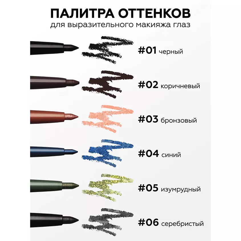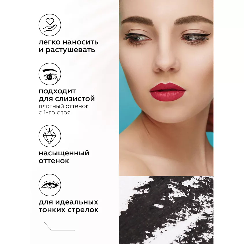 Удобный формат лайнера гигиеничность использования и не требует постоянного затачивания. Мягкая текстура легко наносится и не травмирует кожу век, а также имеет экономичный расход. Лайнер для глаз отлично тушуется, не отпечатывается и моментально фиксируется, подходит даже для нависшего века.