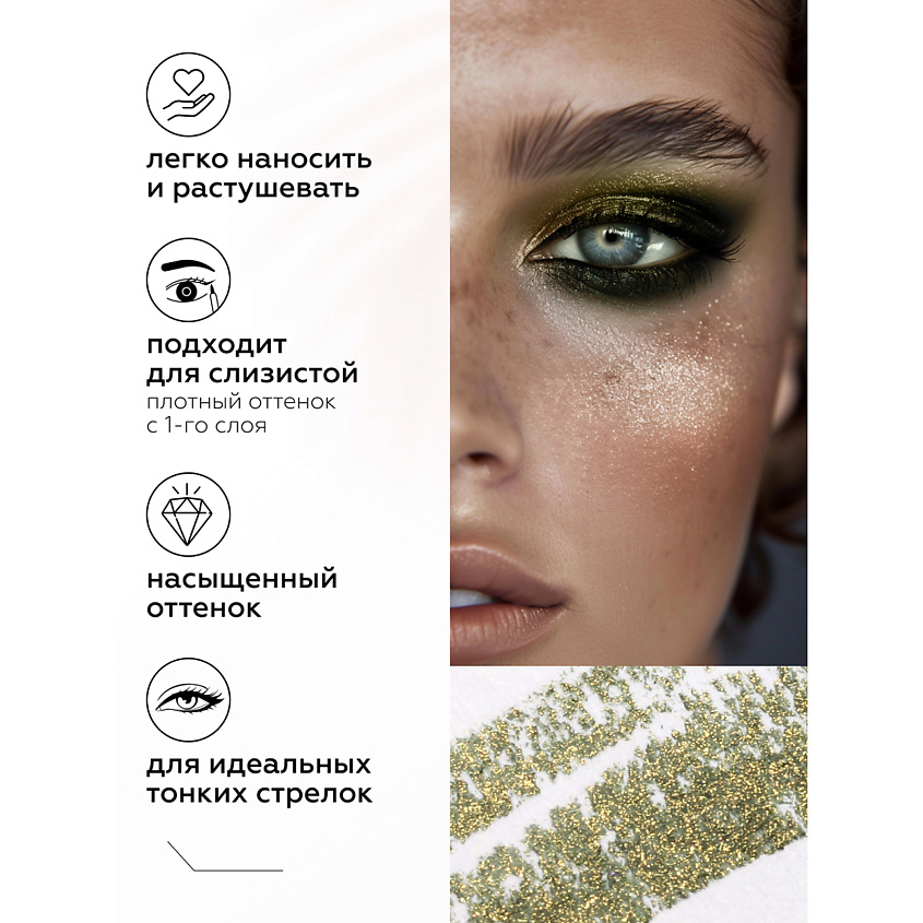 Удобный формат лайнера гигиеничность использования и не требует постоянного затачивания. Мягкая текстура легко наносится и не травмирует кожу век, а также имеет экономичный расход. Лайнер для глаз отлично тушуется, не отпечатывается и моментально фиксируется, подходит даже для нависшего века.