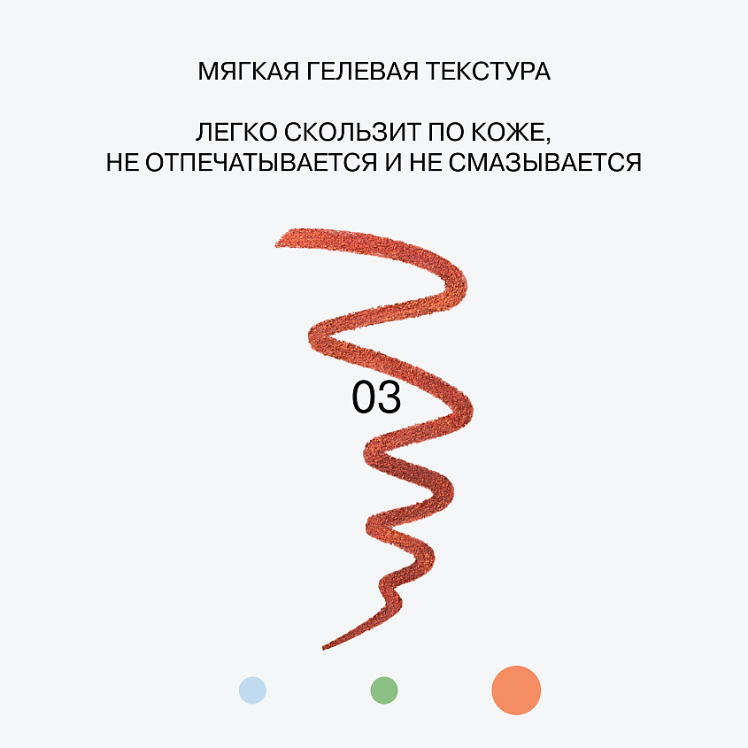 Мягкая комфортная текстура легко скользит по коже, обеспечивая равномерное нанесение даже на слизистой и во внутренних уголках глаз. Карандаш быстро фиксируется, не отпечатывается и не смазывается, оставаясь на веках в течение всего дня.