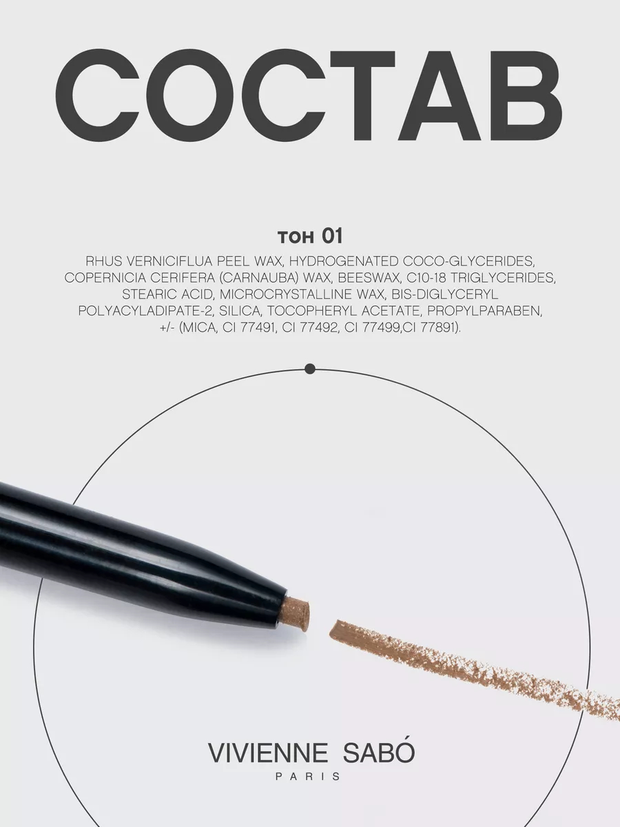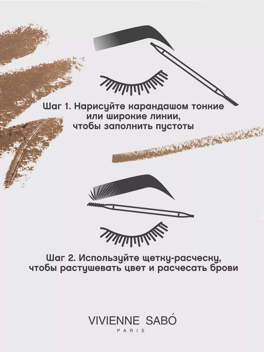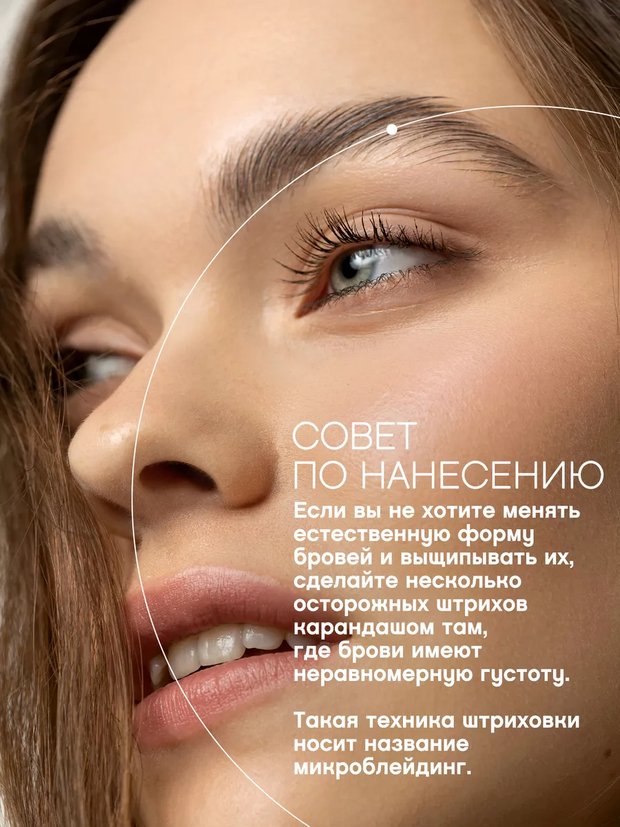 Острозаточенным карандашом прорисовывать коротенькие линии по направлению роста волосков от переносицы к вискам. При нанесении избегать чрезмерного нажима. Для растушёвки и придания естественного вида по окончании нанесения расчёсывать брови щёточкой.Состав