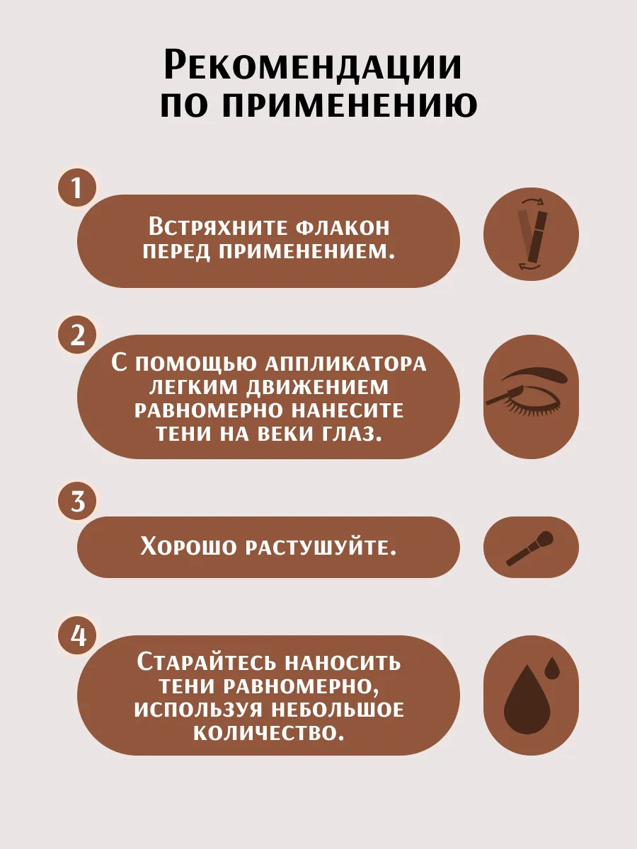 Встряхните флакон перед применением, с помощью аппликатора легким движением равномерно нанесите на веки глаз, выбранный вами оттенок теней, хорошо растушуйте. Старайтесь наносить тени равномерно, используя небольшое количество.Состав