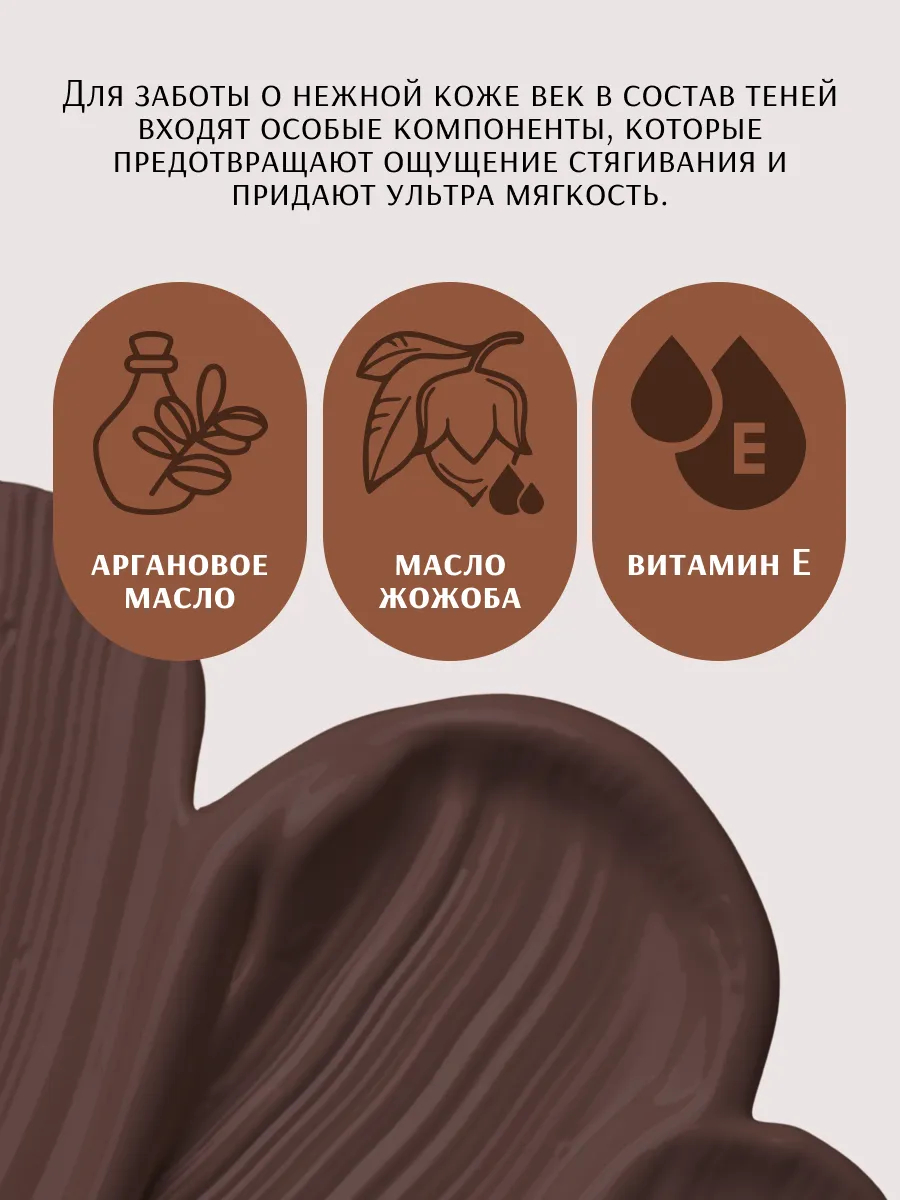 Для заботы о нежной коже век в состав теней входят аргановое и масло жожба, витамин Е, которые предотвращают ощущение стягивания и придают ультрамягкость.