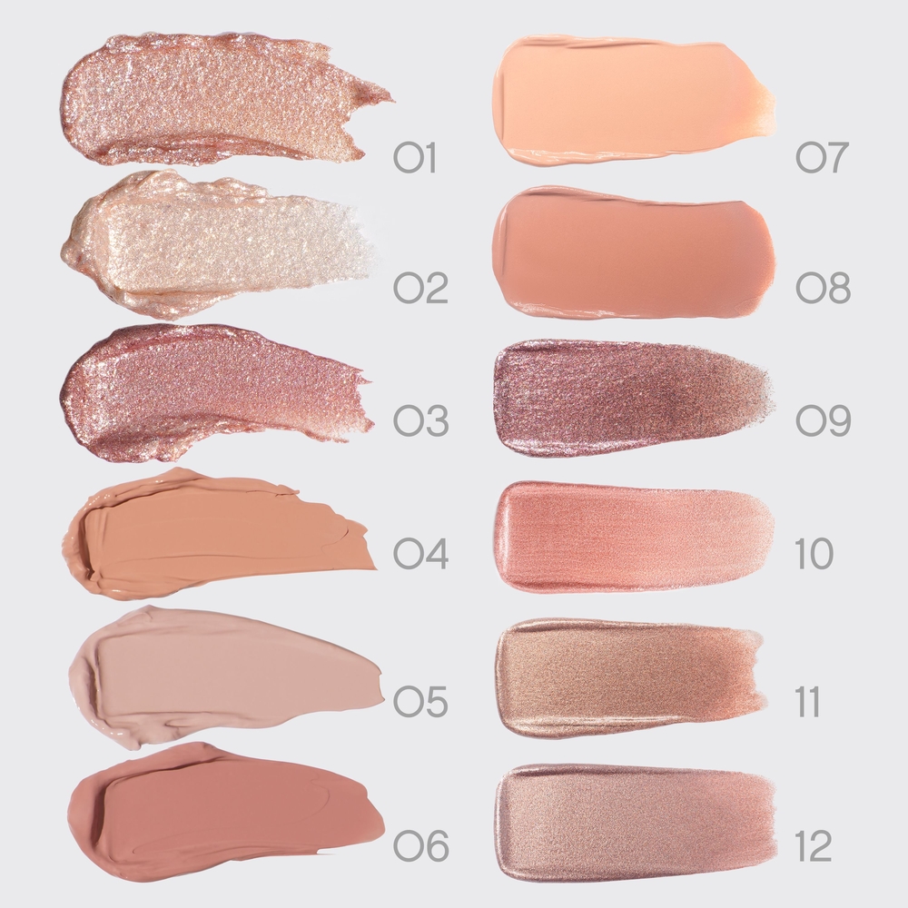 В коллекции шесть оттенков в тактильно приятном флаконе – три мерцающих шиммерных и три водостойких матовых. Тени быстро высыхают, не стягивают веко, не скатываются и не трескаются.
