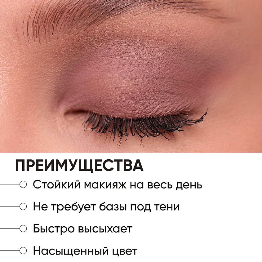 Можно наслаивать тени для получения более интенсивного макияжа глаз. Оптические наполнители и полимеры визуально выравнивают кожу век, уменьшают видимость морщин.