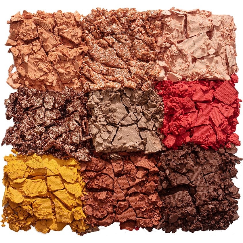 Палетка выполнена в теплых оттенках. В ней есть три светлых базовых цвета – рыжевато-бежевый, светлый и холодный нюд. А также яркие насыщенные тона – желтый, коричневые и обжигающий красный. И чтобы пламя сияло ярче – два сияющих оттенка.