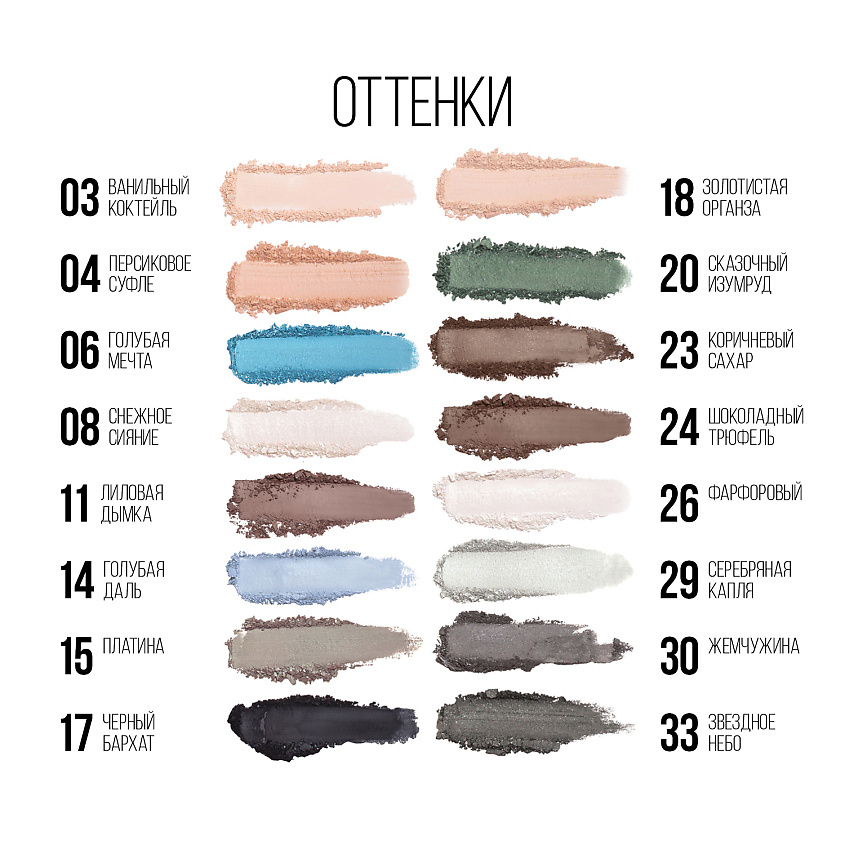 В палитре представлены оттенки с классическим сатиновым финишем 04, 06, 11, 20; универсальные матовые тона 03, 14, 17, 24, 26 и выразительные шиммеры для сияющего гламурного образа 08, 15, 18, 23, 29, 30, 33.