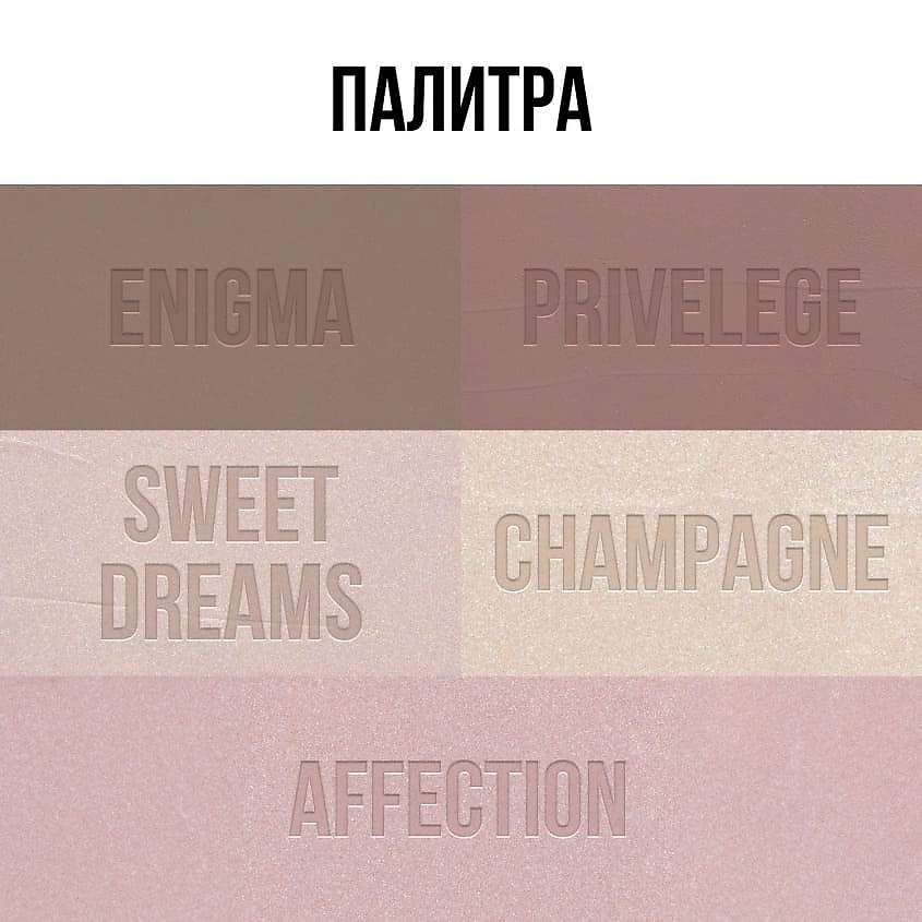 Представлены в пяти натуральных оттенках: дымчато -бежевом (01 – Enigma) и дымчато-розовом (02 – Privilege) с матовым финишем, холодно-розовом (03 – Sweet dreams), золотисто-бежевом (04 – Champagne) и золотисто-розовом (05 – Affection) с сияющим финишем.