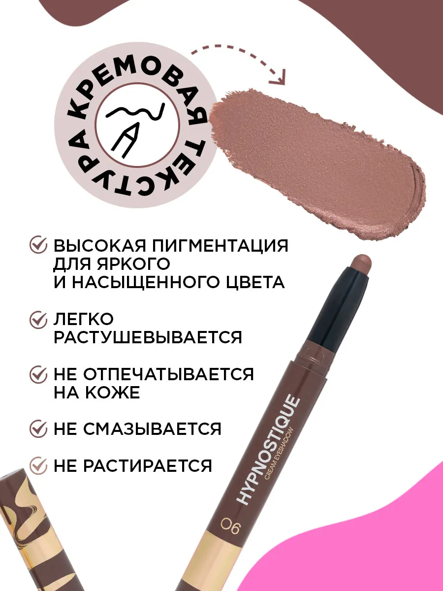 Кремовые тени в стике Hypnostique – это настоящее волшебство в твоей косметичке. Шесть оттенков с матовым и сатиновым финишем помогут создать различные эффекты: от легкого освежающего акцента до яркого драматического макияжа, который будет мерцать и переливаться, словно звезды на ночном небе.