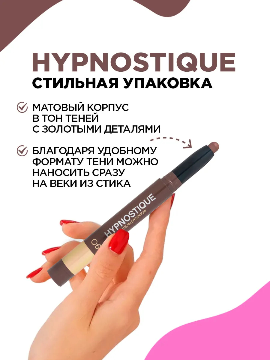 Благодаря формату стика тени можно легко и быстро наносить на веки, распределять и смешивать друг с другом, создавая разные образы и градиенты. Кремовая текстура обеспечивает высокую пигментацию, что позволяет добиться яркого и насыщенного цвета. Hypnostique упакованы в матовый корпус в тон теней с золотыми деталями на крышке.