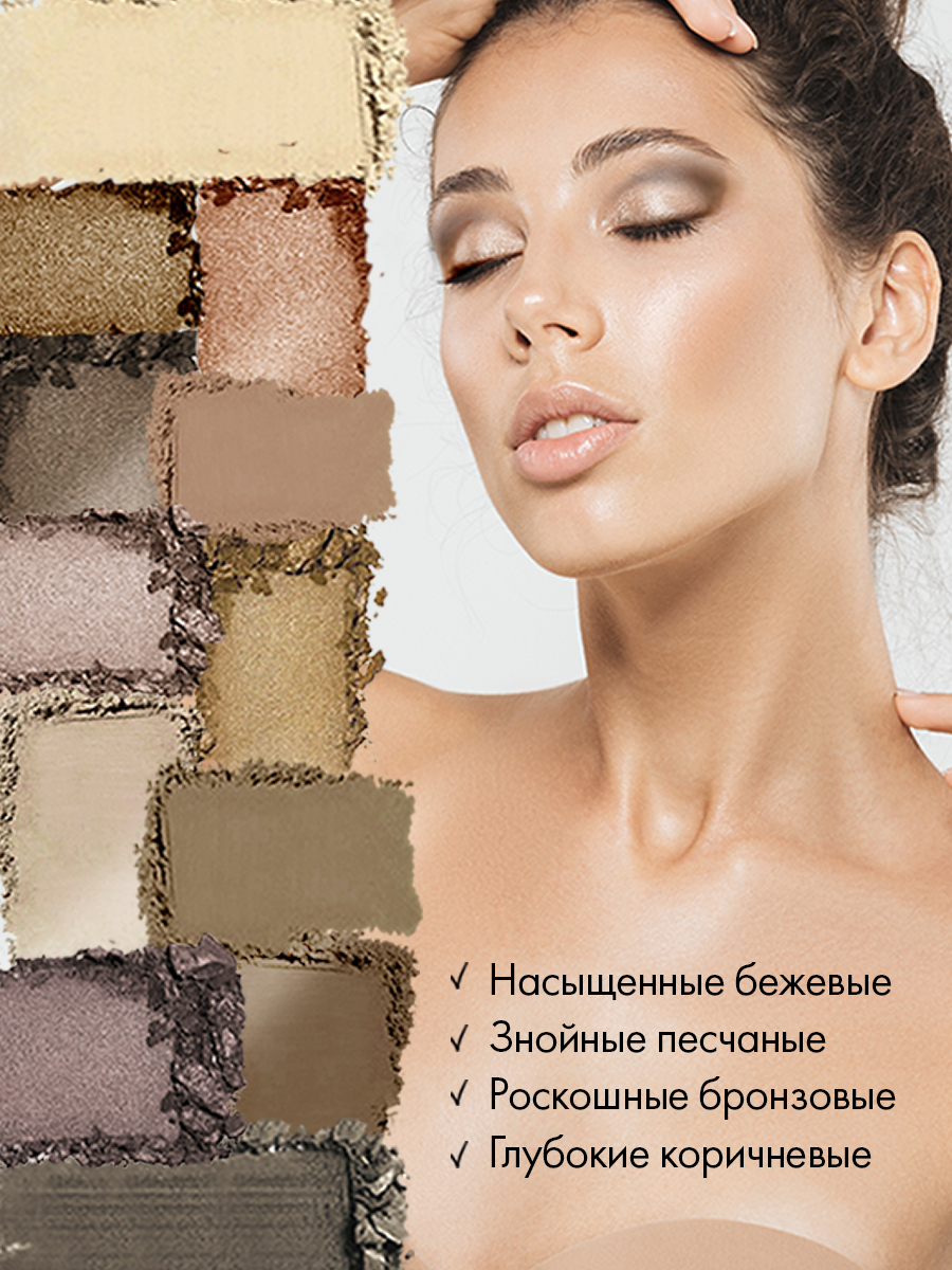 Цветовая гамма палетки теней для век помогает легко создать проверенную временем классику и трендовый макияж в стиле nude, придать взгляду чувственность и сексуальность.