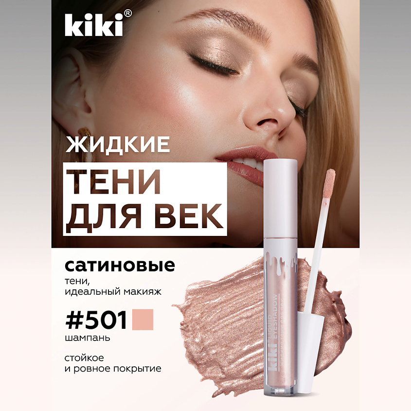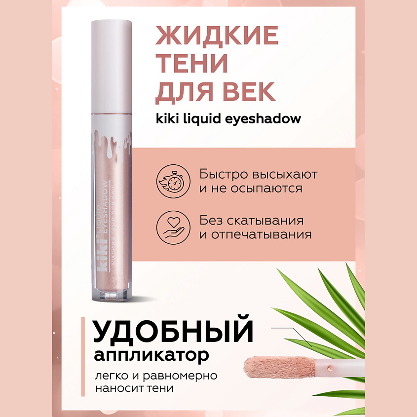 Жидкие тени для век KIKI "Liquid Eyeshadow" имеют мягкую текстуру и удобный бархатный аппликатор, который позволяет легко, равномерно наносить и растушёвывать тени.