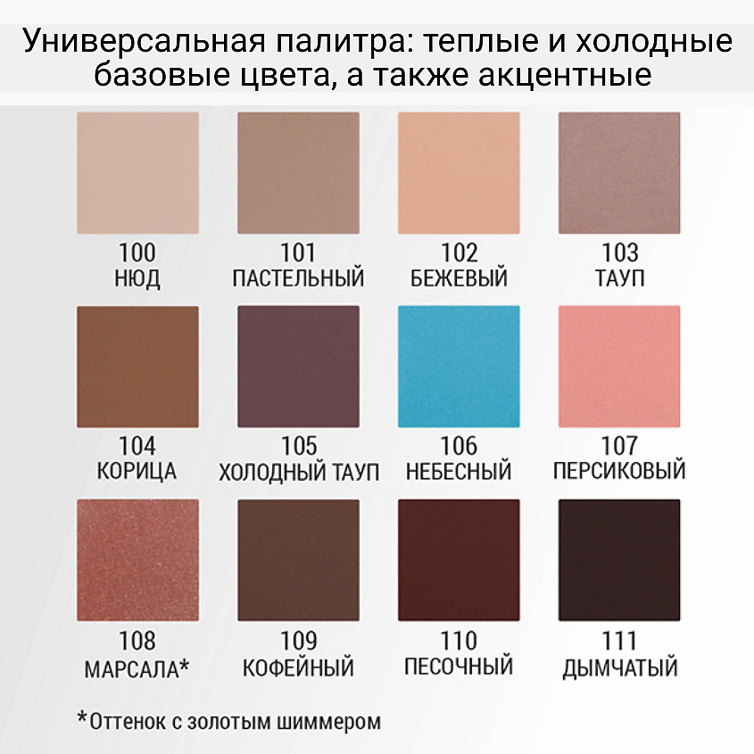 Визажисты составили универсальную палитру из теплых и холодных базовых, а также акцентных тонов, которая соберет ваш повседневный образ или дополнит изысканный вечерний выход.