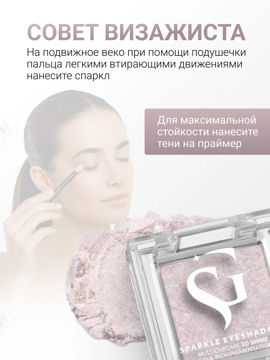 На подвижное веко при помощи подушечки пальца легкими втирающими движениями нанесите спаркл. Для максимальной стойкости наносите тени на праймер.Состав