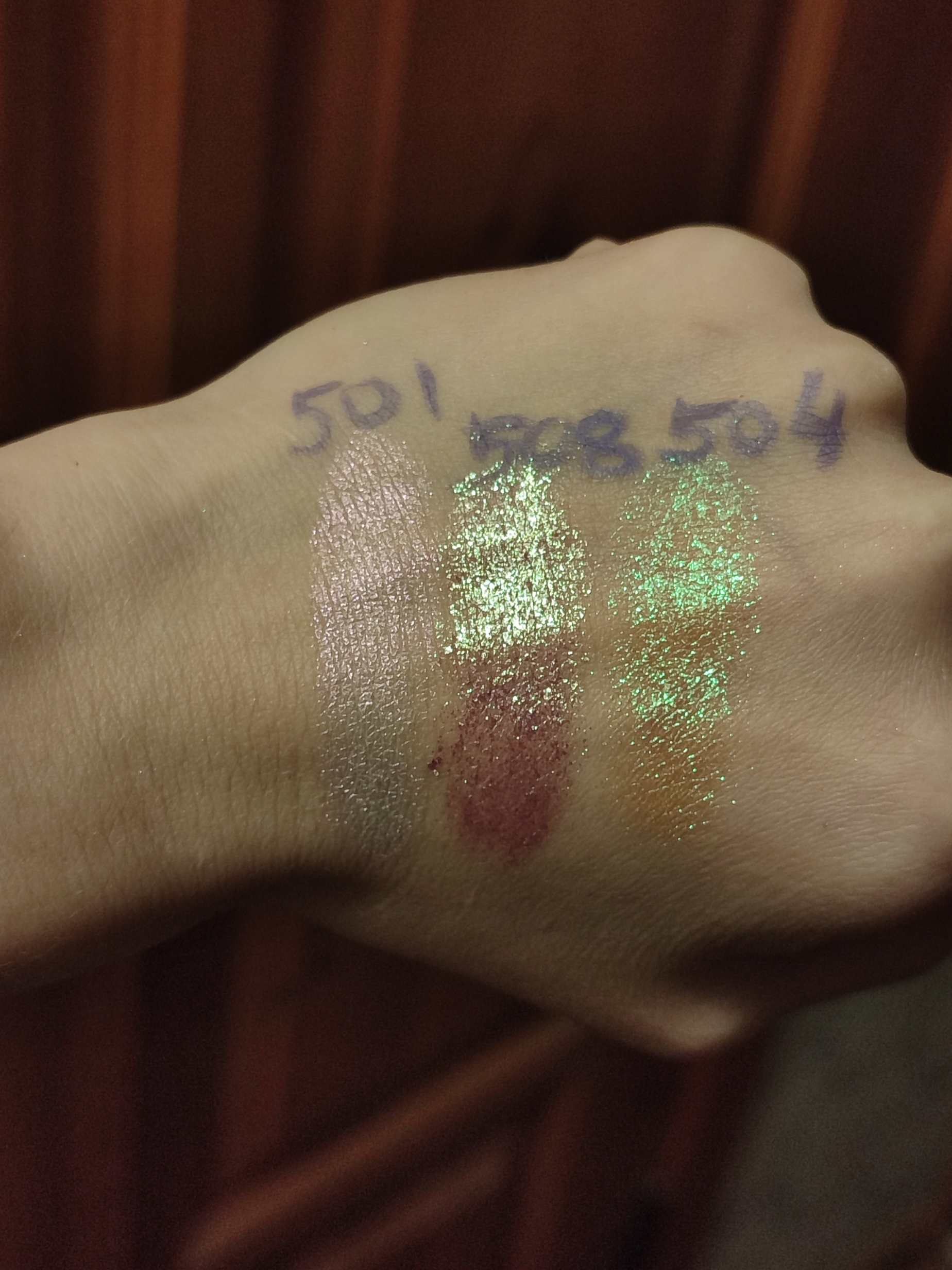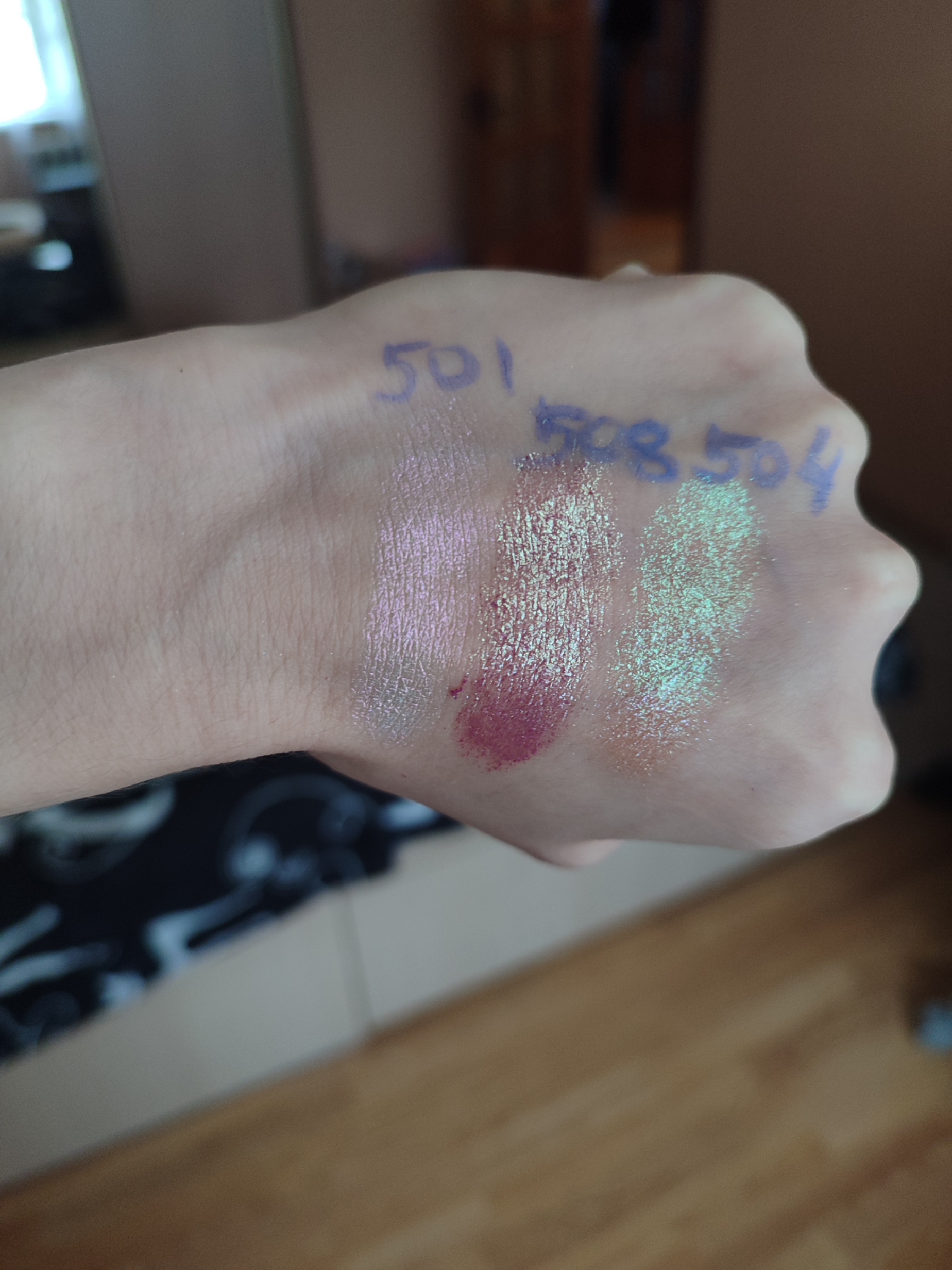 Оооочень красивое сияние. Пока купила только 3 оттенка, у оттенков 504 и 508 - более "подвижная" текстура, нужно аккуратно наносить, немного крошатся, но сияют шикарно :) 1 фото - дневной свет, 2 - искусственное освещение.
